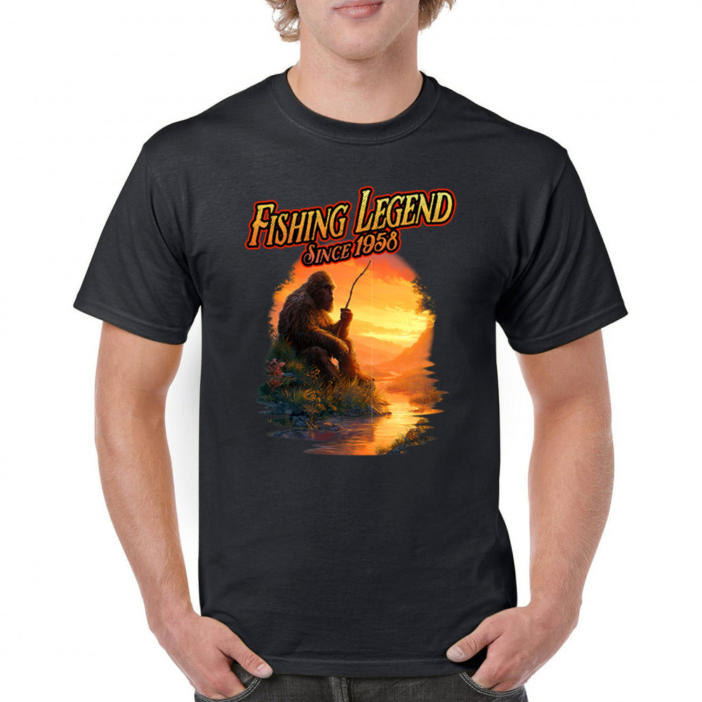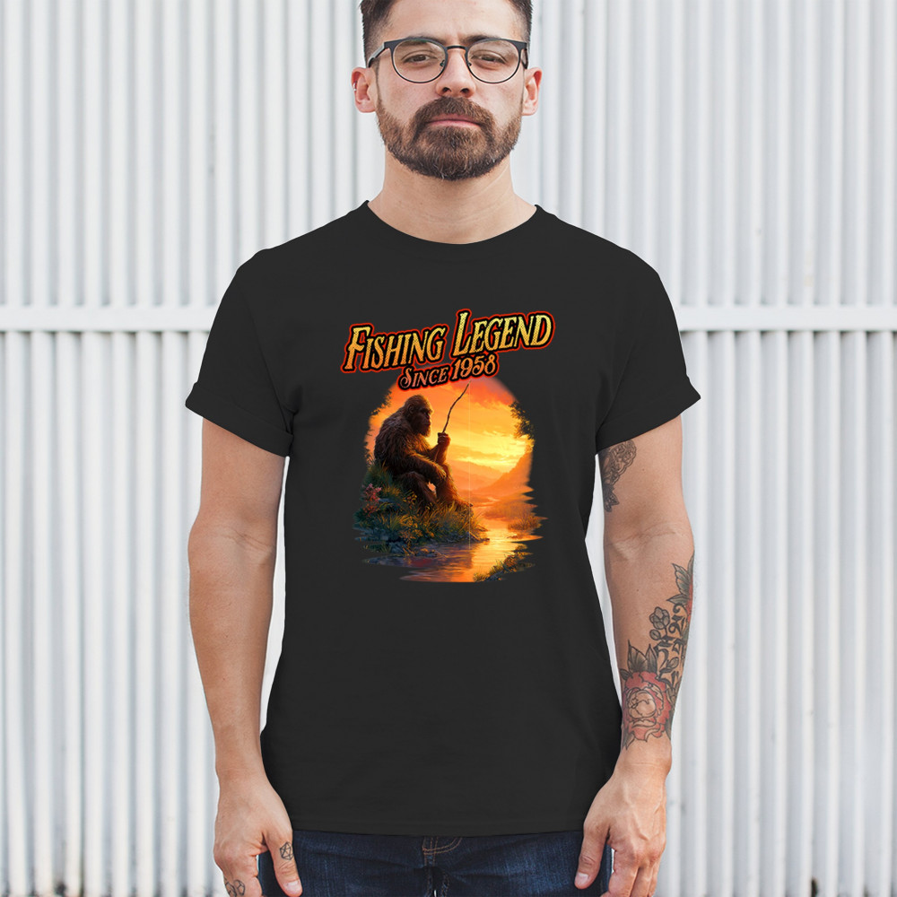 Bigfoot fishing legend design with Sasquatch lifestyle, retro vintage humor, funny wilderness shirt, Father’s Day gift, and campfire style.