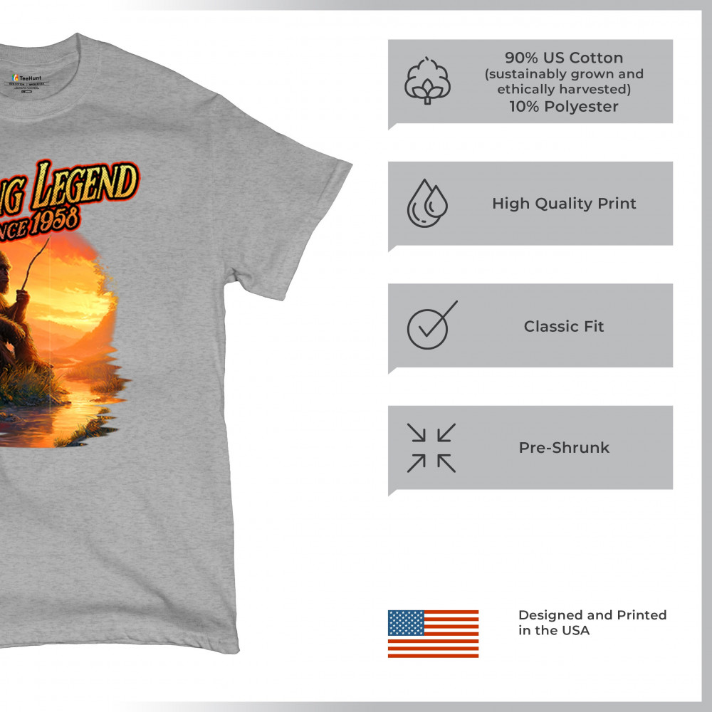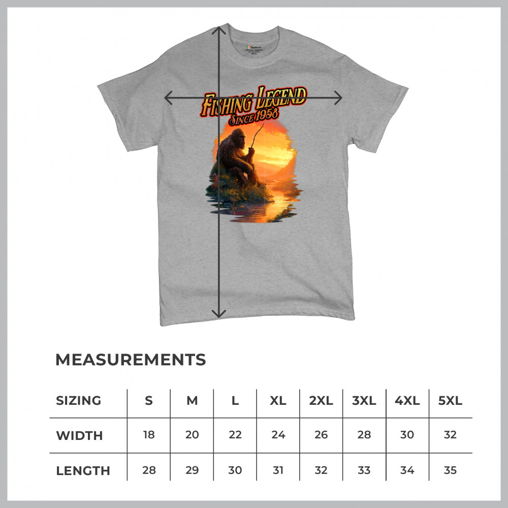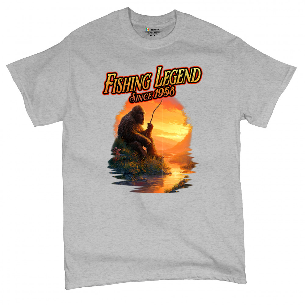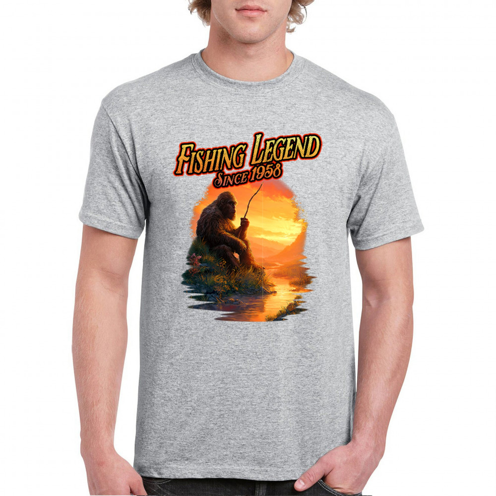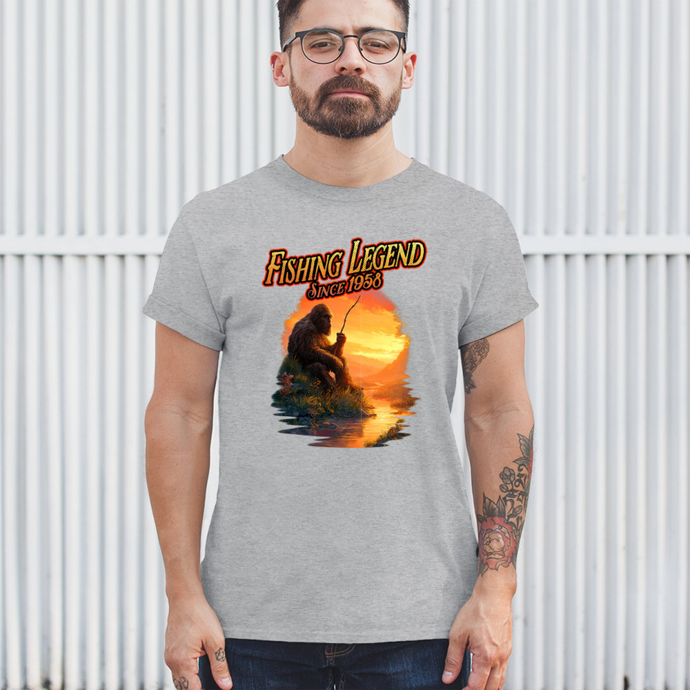 Bigfoot fishing legend design with Sasquatch lifestyle, retro vintage humor, funny wilderness shirt, Father’s Day gift, and campfire style.