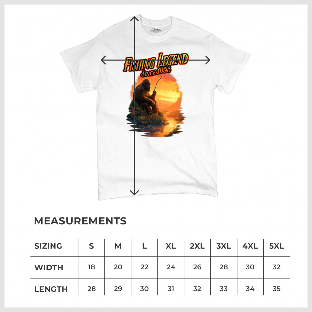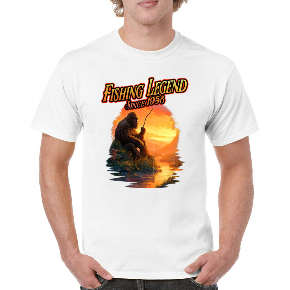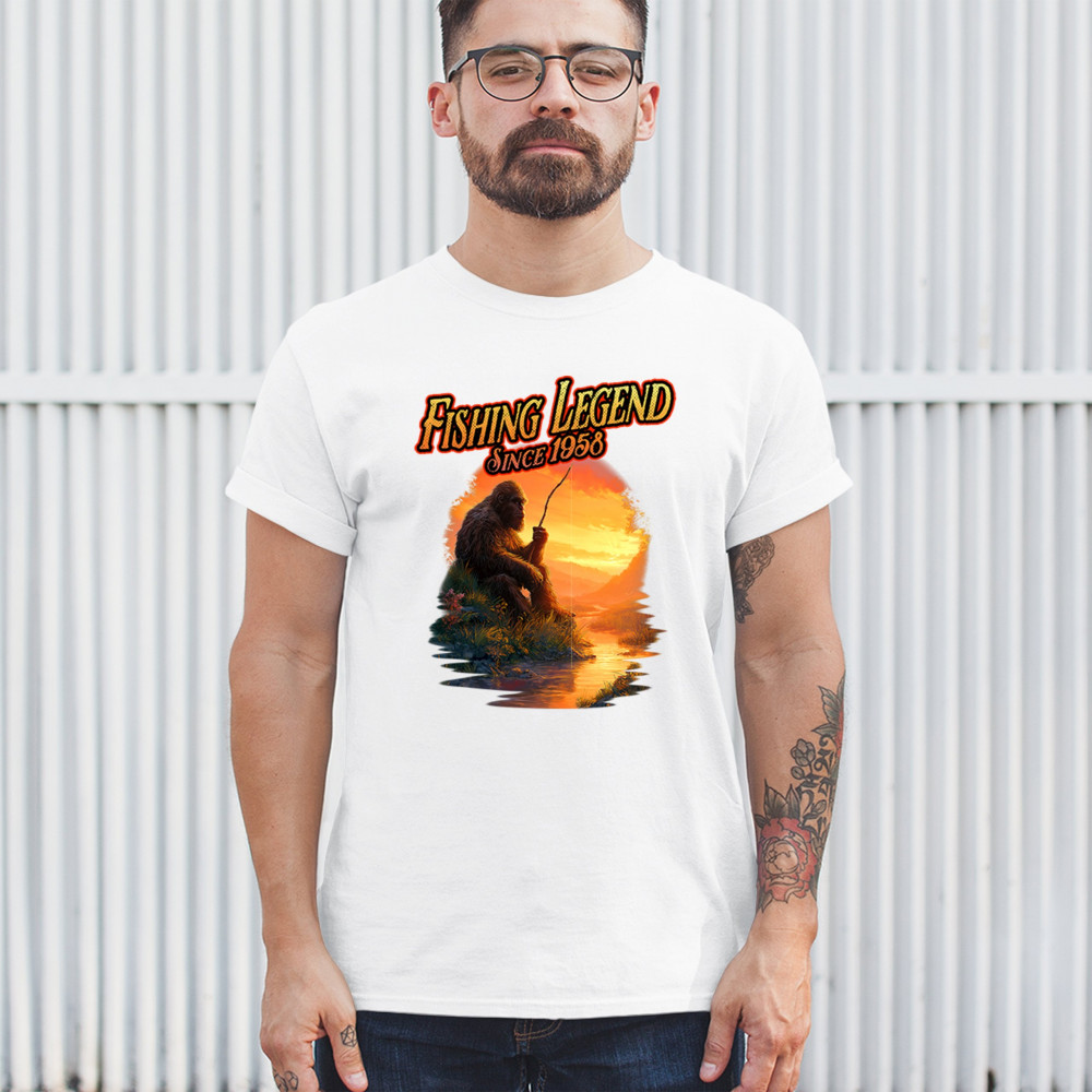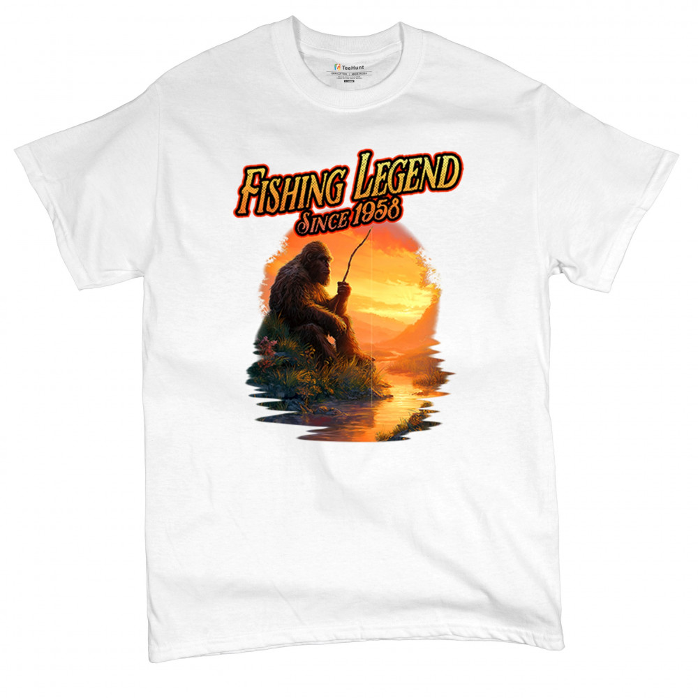 Bigfoot fishing legend design with Sasquatch lifestyle, retro vintage humor, funny wilderness shirt, Father’s Day gift, and campfire style.