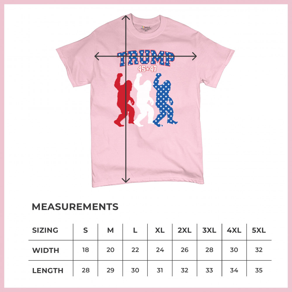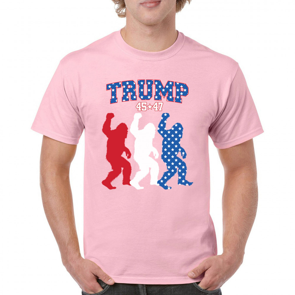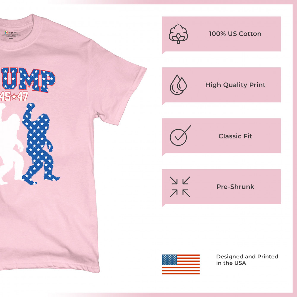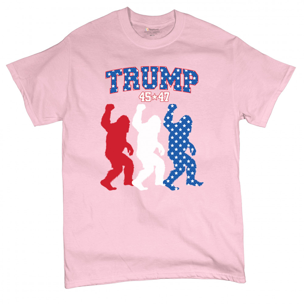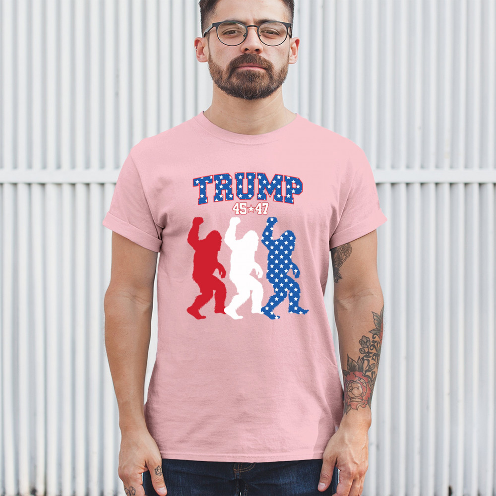 Trump 45/47 Bigfoot design in red, white, and blue with American flag stars. Celebrate patriotism, humor, and the fight for America First values.