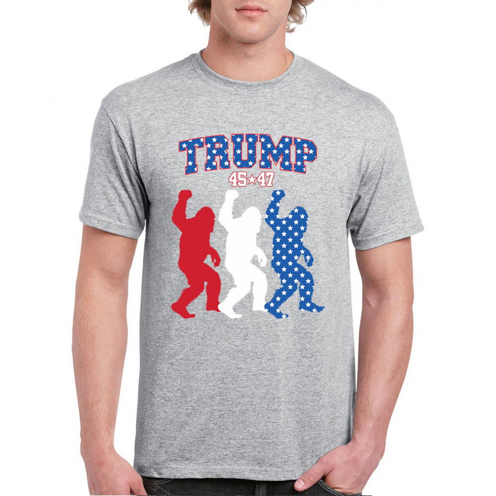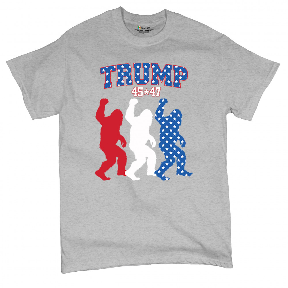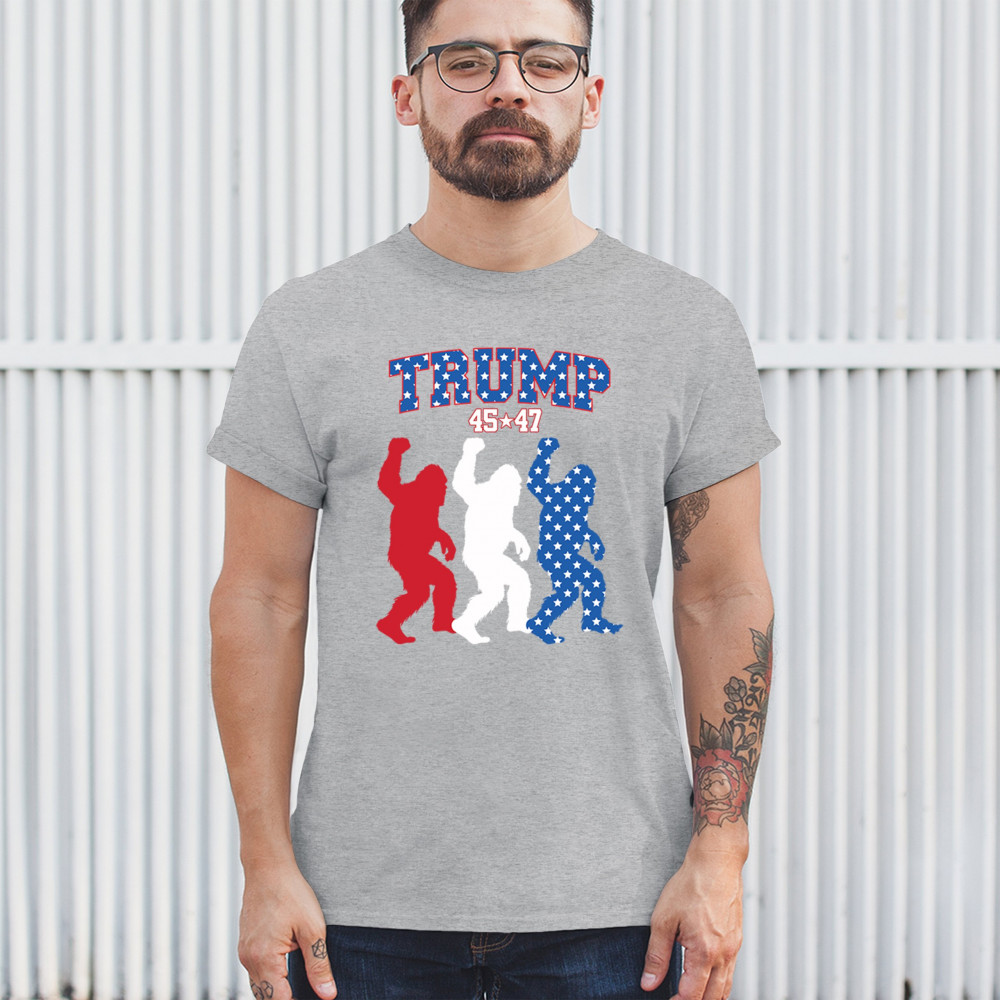 Trump 45/47 Bigfoot design in red, white, and blue with American flag stars. Celebrate patriotism, humor, and the fight for America First values.