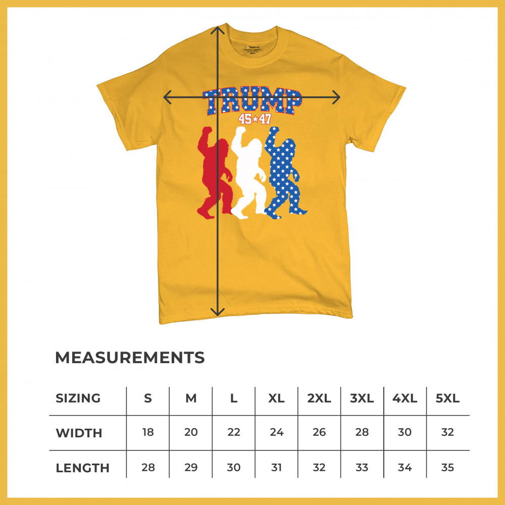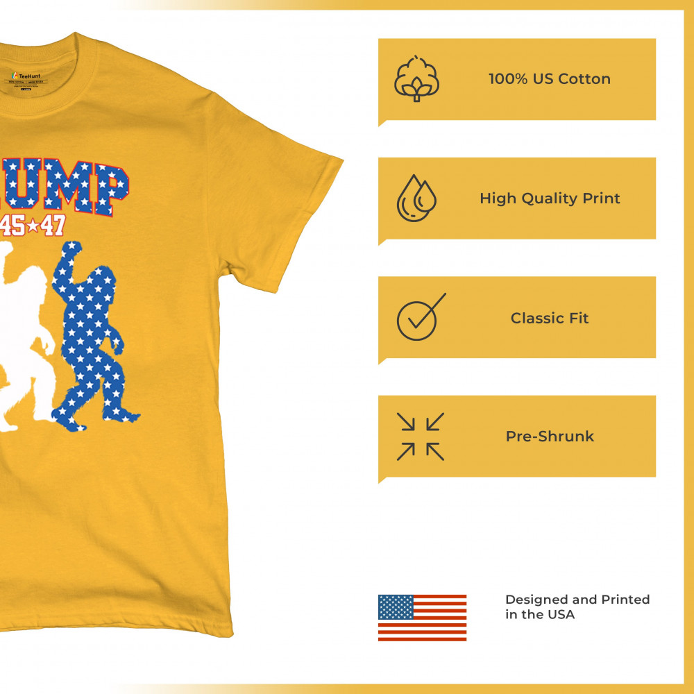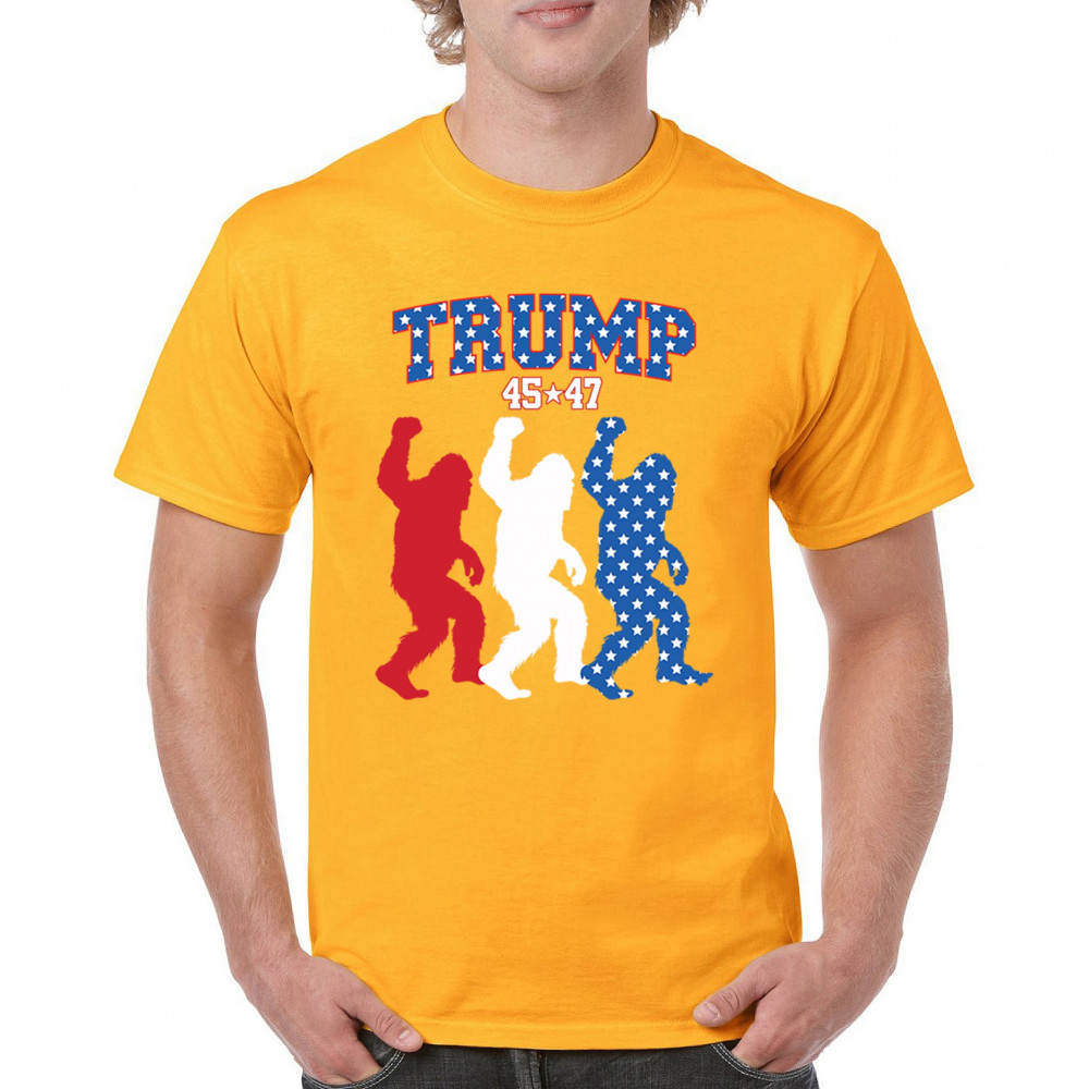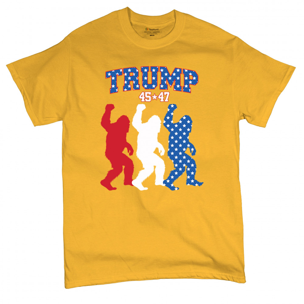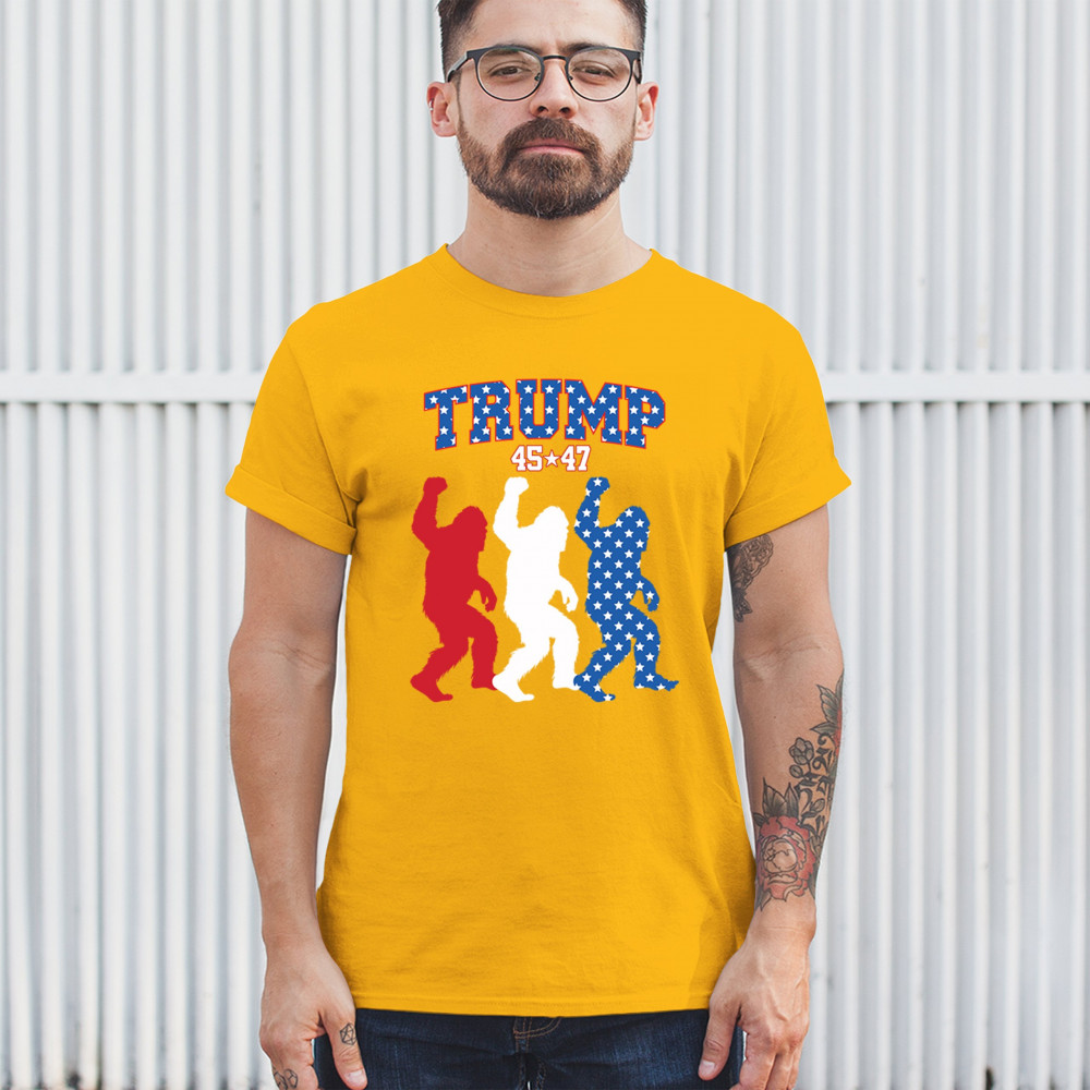 Trump 45/47 Bigfoot design in red, white, and blue with American flag stars. Celebrate patriotism, humor, and the fight for America First values.