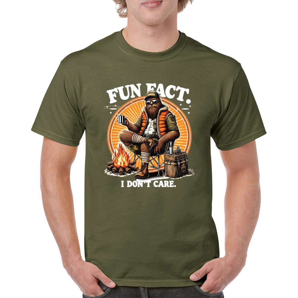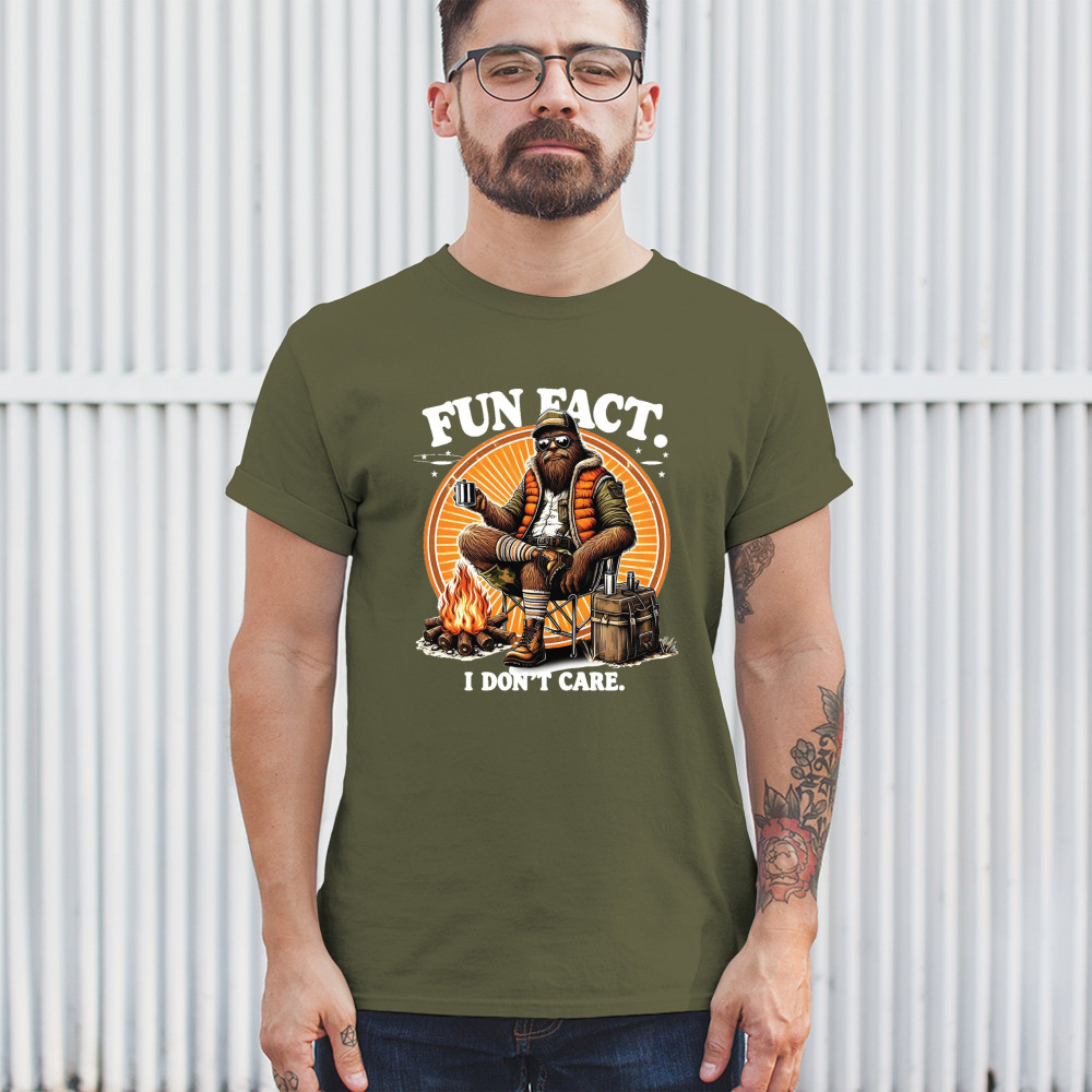 Funny Bigfoot Fun Fact design with cryptid humor, sarcastic outdoors shirt vibe, retro Sasquatch saying, USA pride, and camping adventure style.