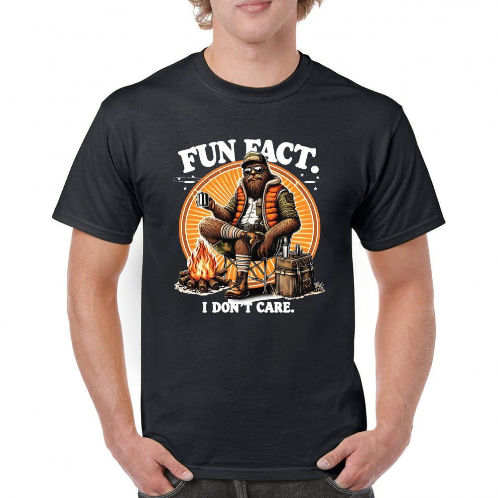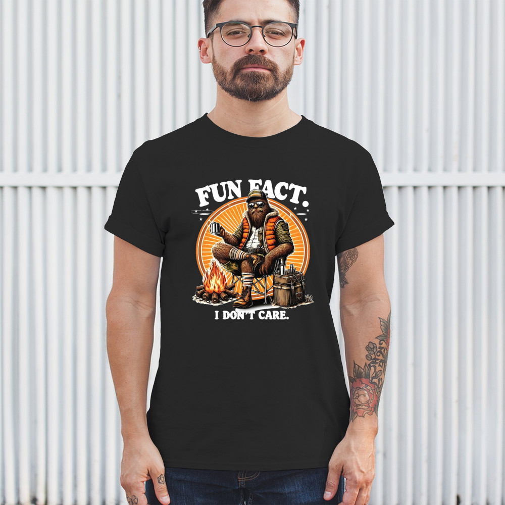 Funny Bigfoot Fun Fact design with cryptid humor, sarcastic outdoors shirt vibe, retro Sasquatch saying, USA pride, and camping adventure style.