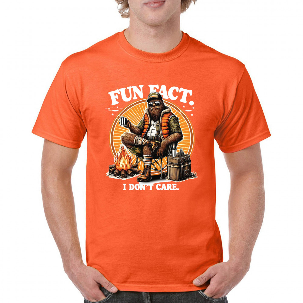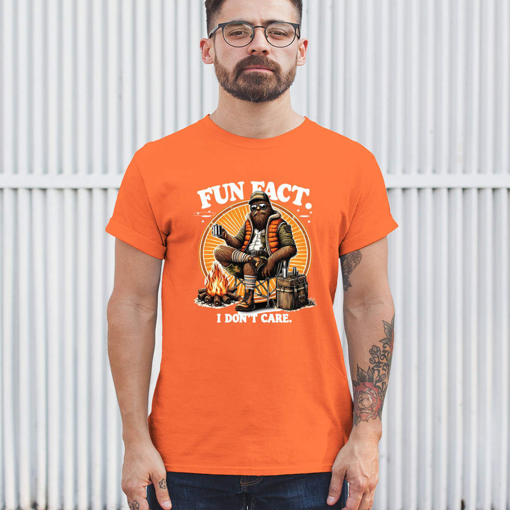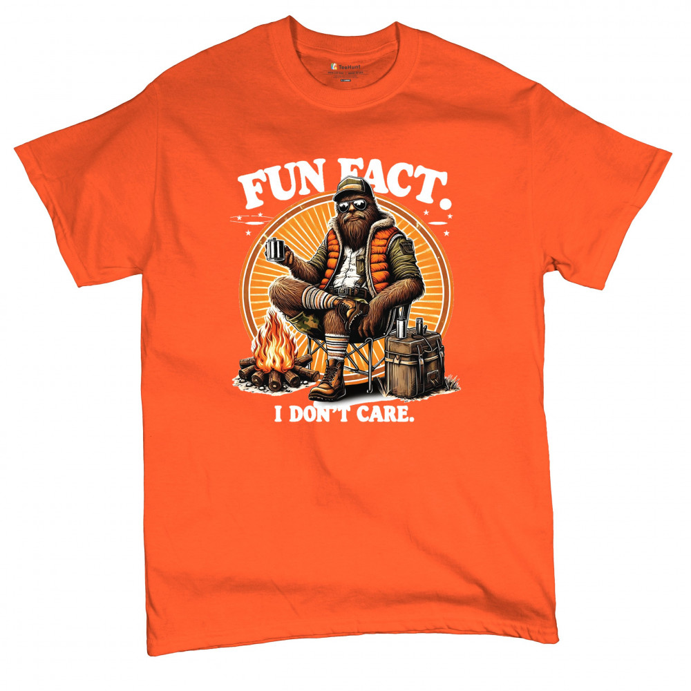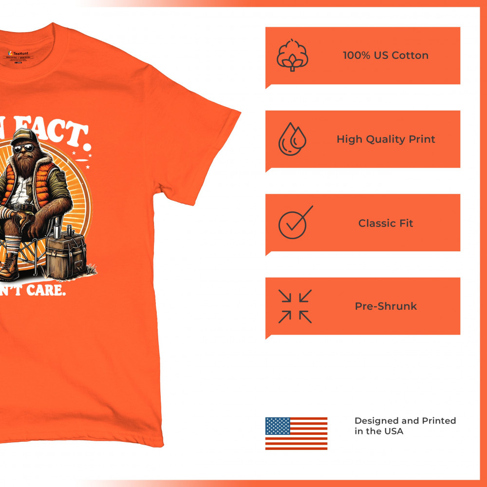 Funny Bigfoot Fun Fact design with cryptid humor, sarcastic outdoors shirt vibe, retro Sasquatch saying, USA pride, and camping adventure style.