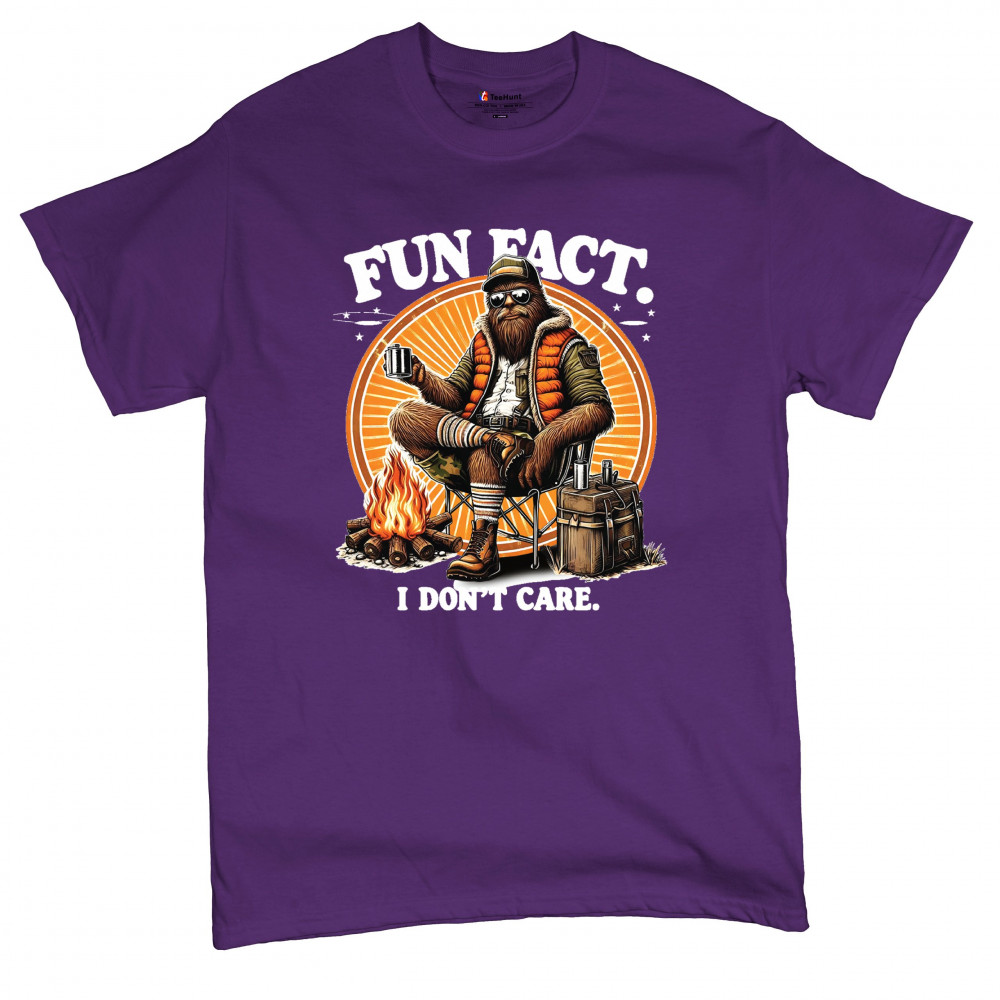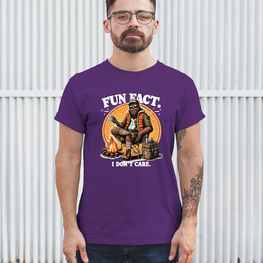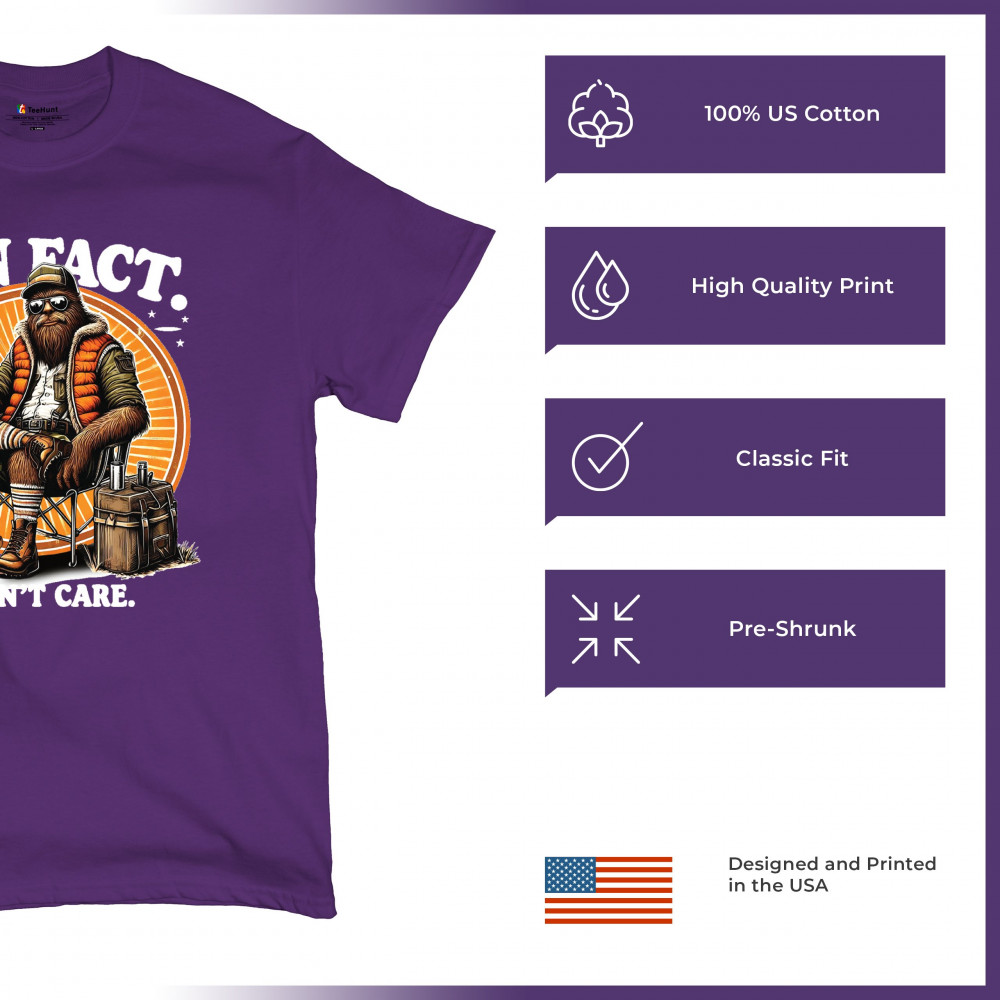 Funny Bigfoot Fun Fact design with cryptid humor, sarcastic outdoors shirt vibe, retro Sasquatch saying, USA pride, and camping adventure style.