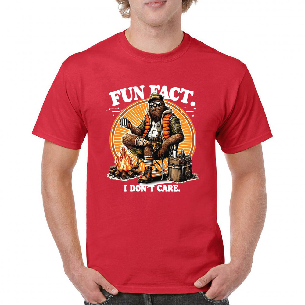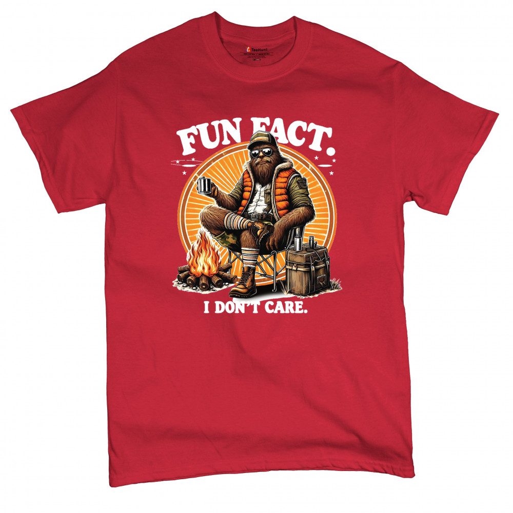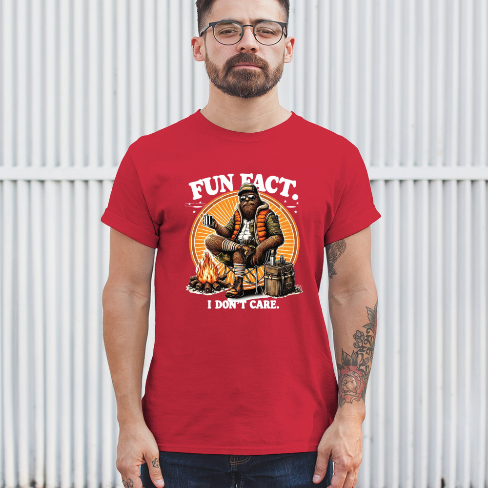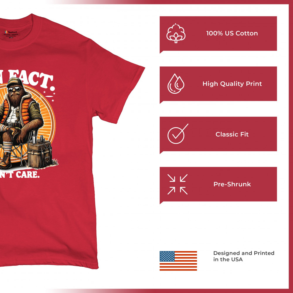 Funny Bigfoot Fun Fact design with cryptid humor, sarcastic outdoors shirt vibe, retro Sasquatch saying, USA pride, and camping adventure style.