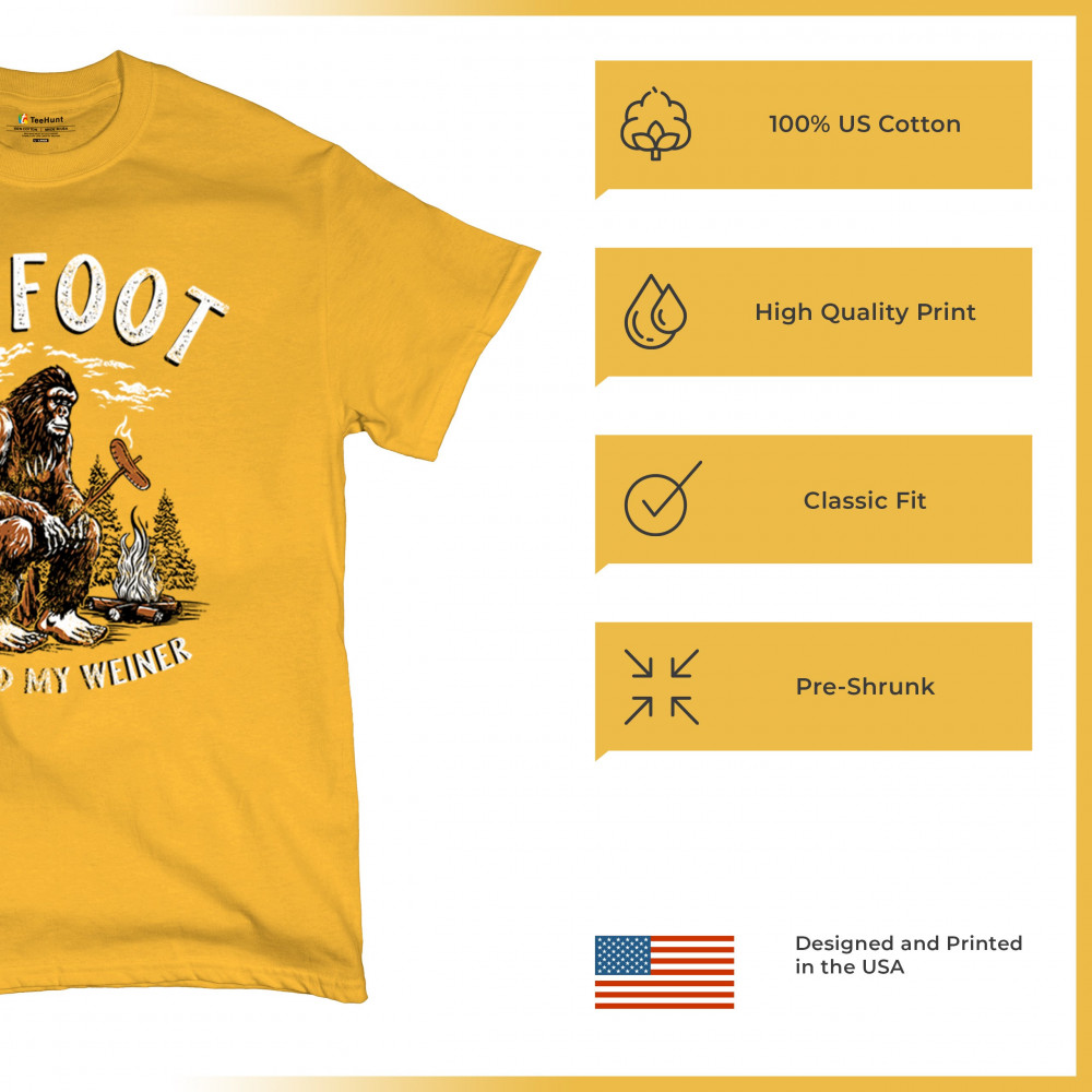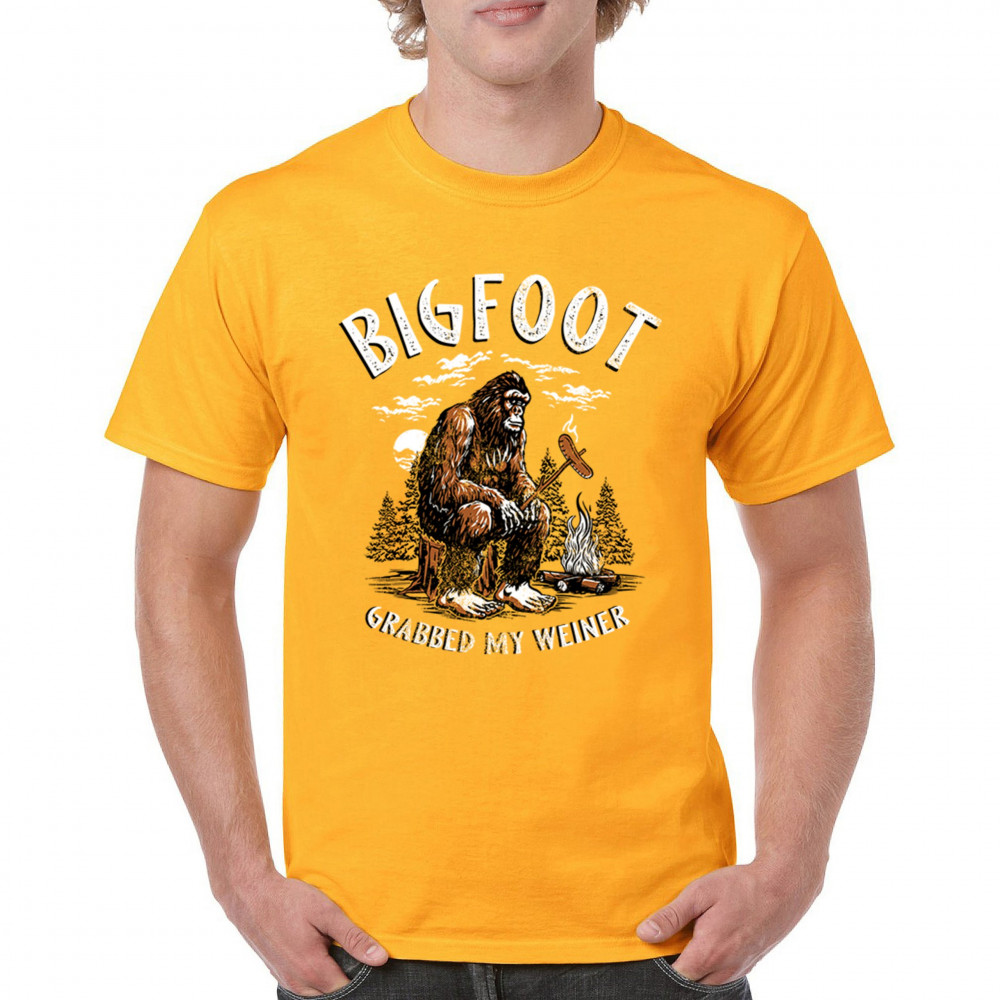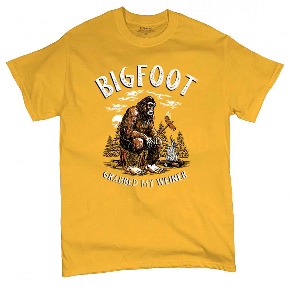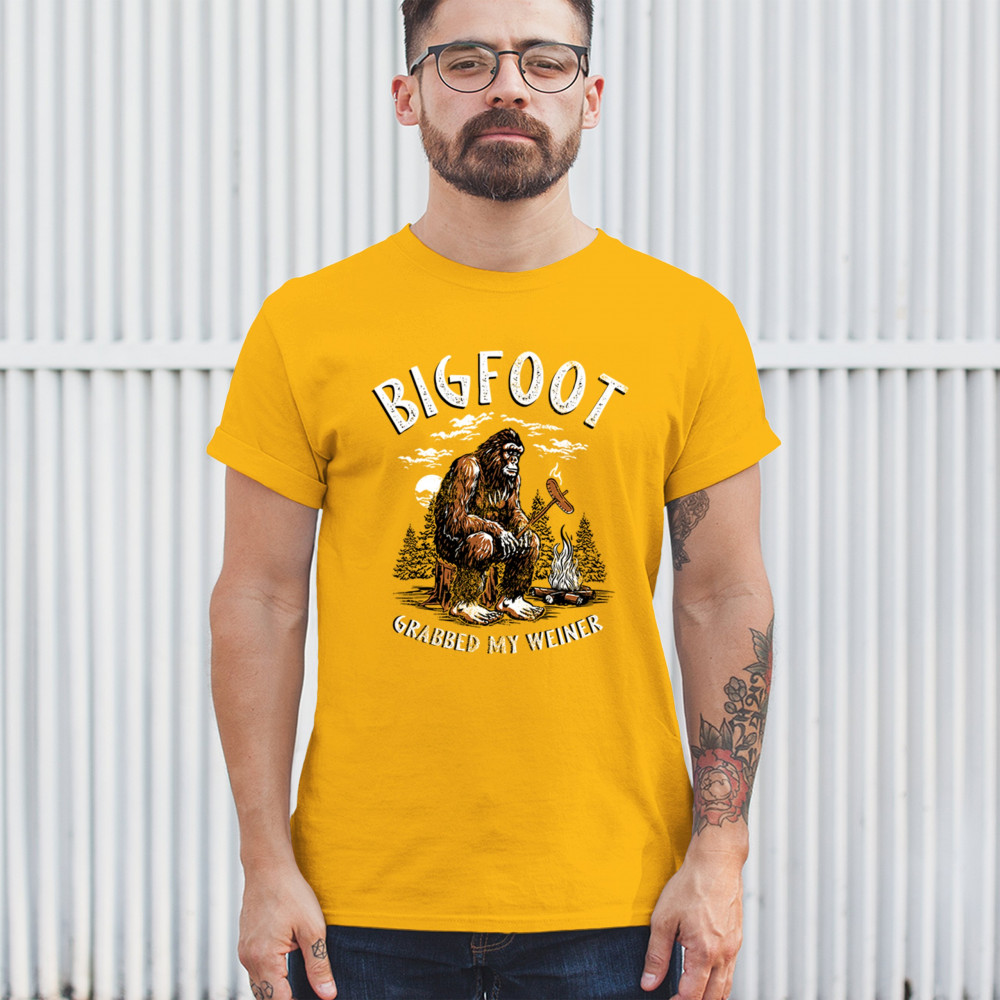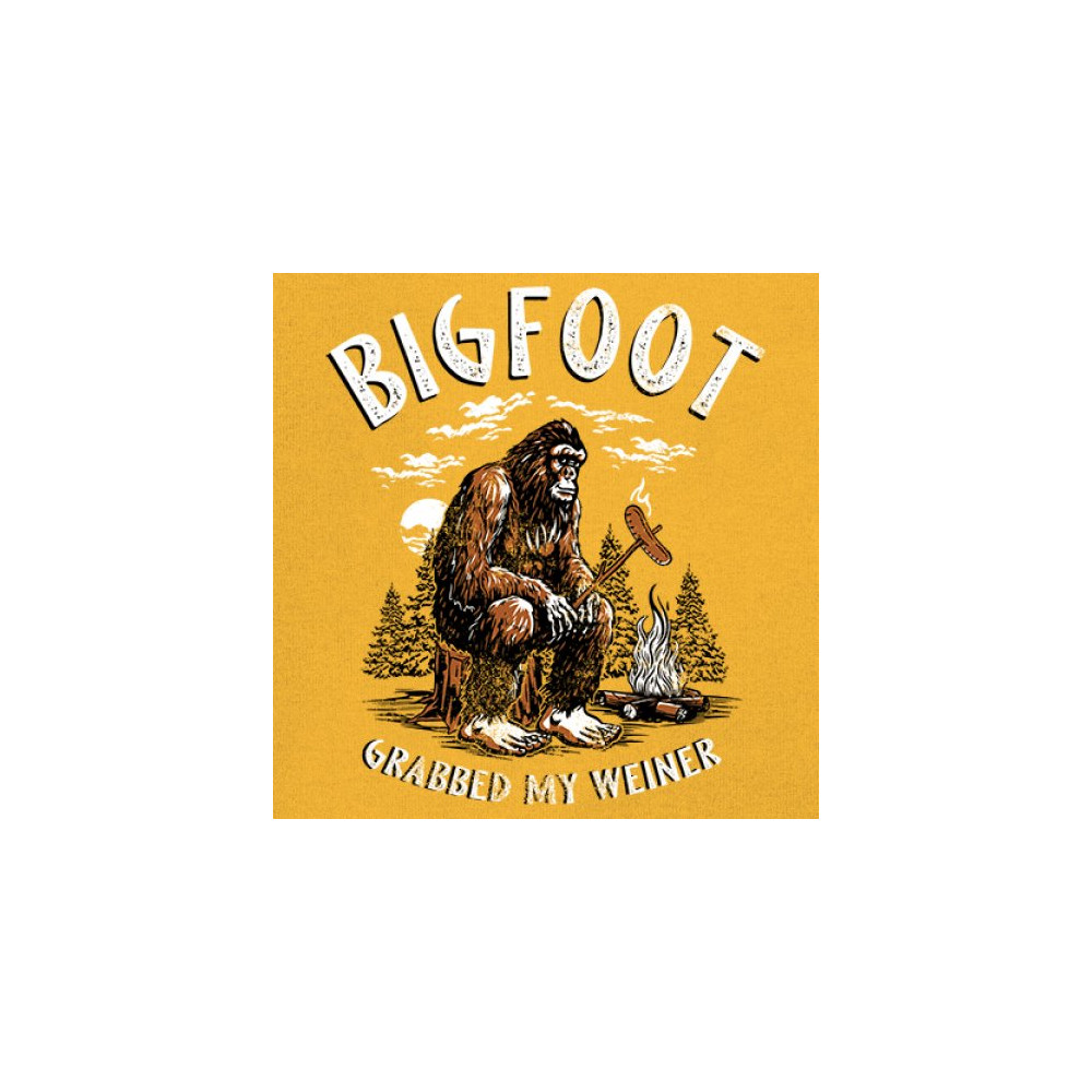 The Bigfoot Grabbed My Weiner design brings cheeky campfire humor to your outdoor adventures. Featuring a cartoon-style Sasquatch roasting a sausage by the fire, it’s perfect for cryptid lovers, campers, and jokesters. Ideal for BBQs, bonfires, forest festivals, and anyone who enjoys weiner jokes with their wilderness.