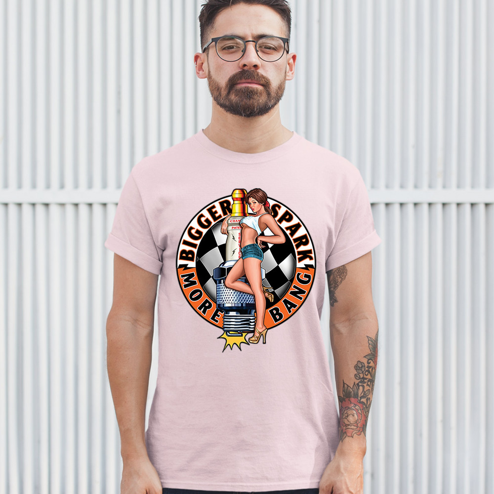 BIGGER SPARK MORE BANG t-shirt pin-up girl vintage automotive men's tee light pink