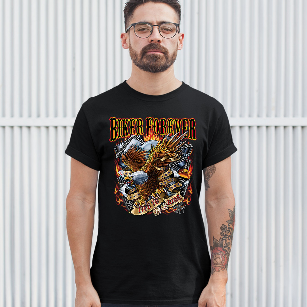 A print featuring an American bald eagle, holding a stripe with "live to ride" written on it, a v-engine in the background, a pair of dice and playing cards. At the top the print says: "biker forever". A great choice for a motorcycle enthusiast.