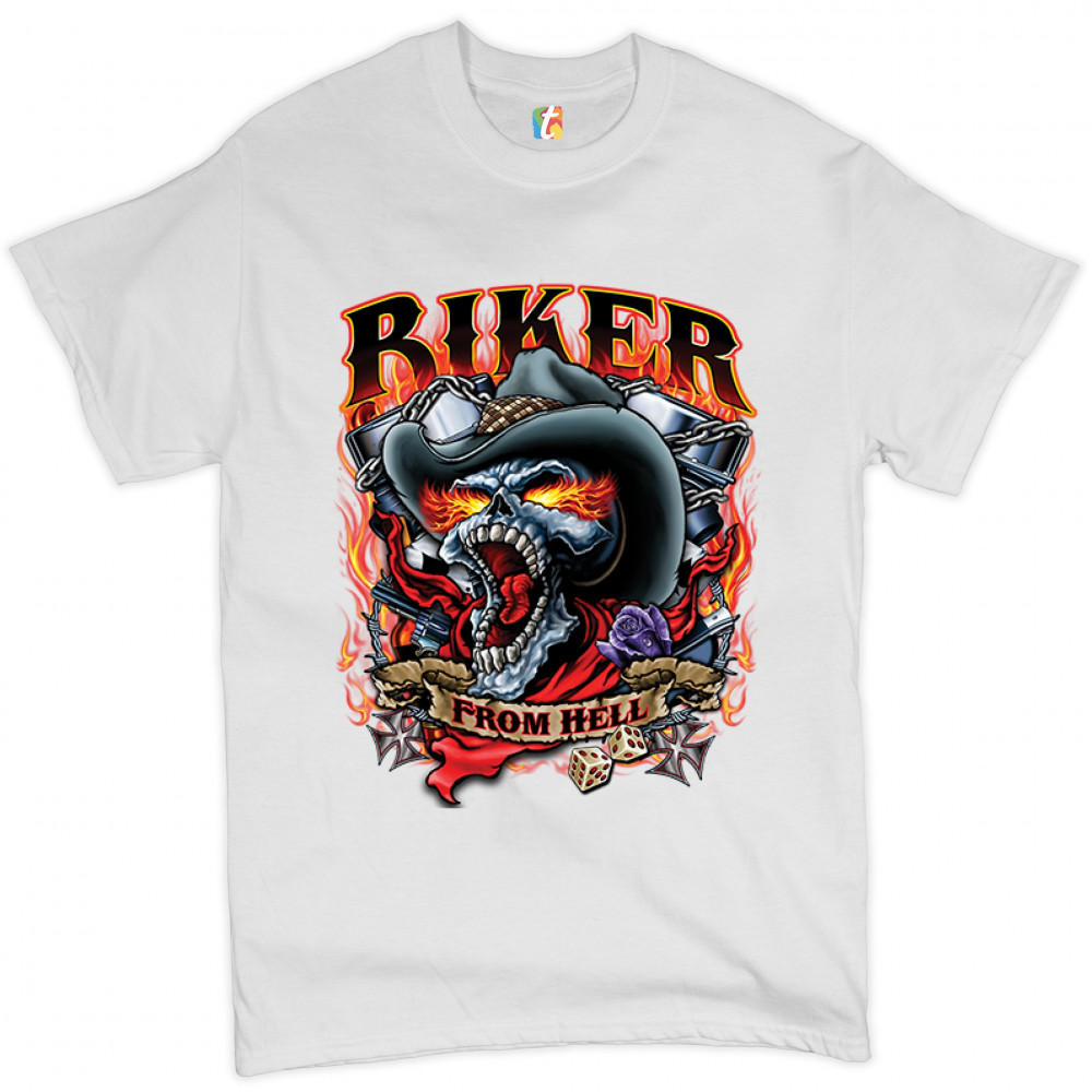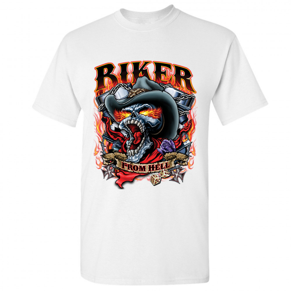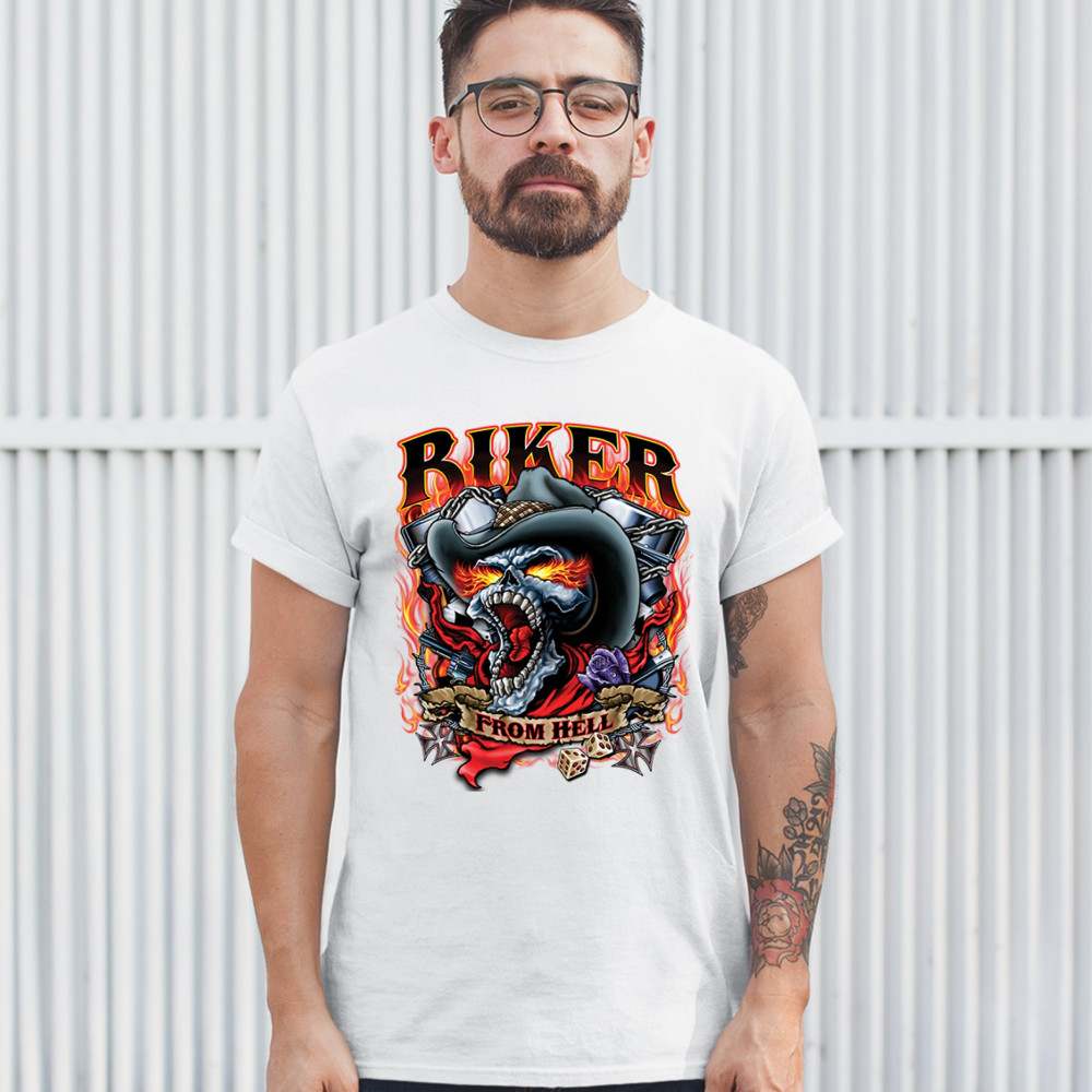 A print featuring a roaring skeleton with burning eyes wearing a cowboy's hat. There are also crosses, dice, a rose and a revolver. The print says: "biker from hell". A great choice for a motorcycle enthusiast.