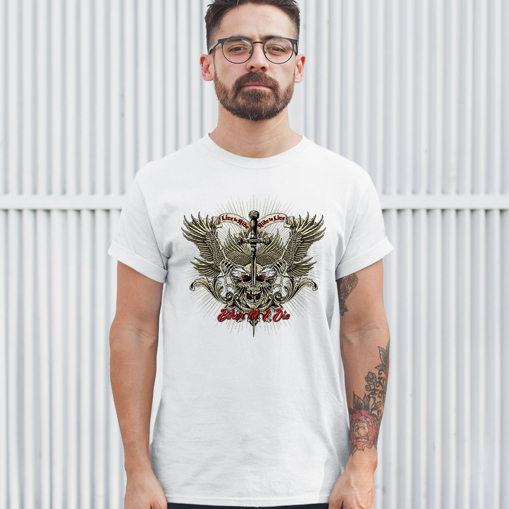 A print featuring a complex structure of wings, bones and a skull in the center with a dagger piercing it's nasal cavity. The print says: "live to ride", "ride to live" and "biker til I die". A great choice for a motorcycle enthusiast.