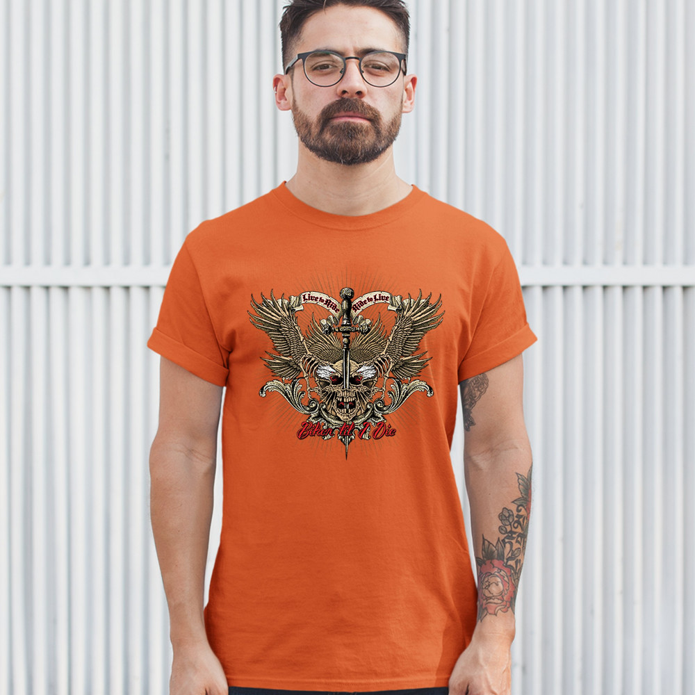 BIKER TIL I DIE t-shirt live to ride biker forever skull face men's tee orange