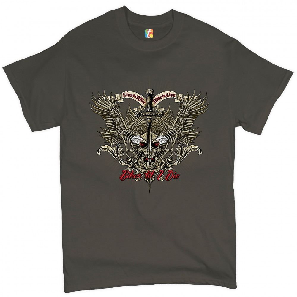 BIKER TIL I DIE t-shirt live to ride biker forever skull face men's tee charcoal