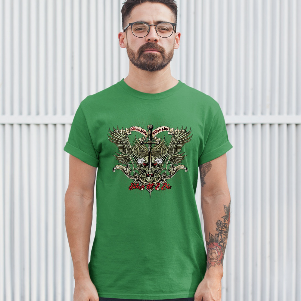 A print featuring a complex structure of wings, bones and a skull in the center with a dagger piercing it's nasal cavity. The print says: "live to ride", "ride to live" and "biker til I die". A great choice for a motorcycle enthusiast.