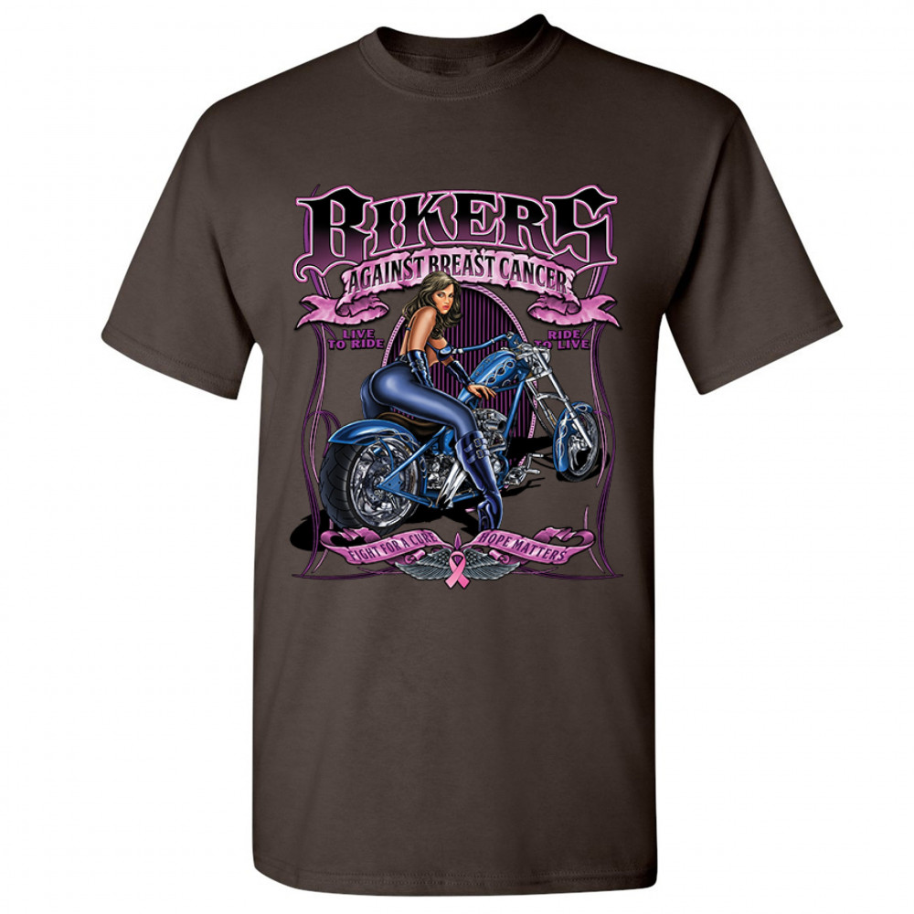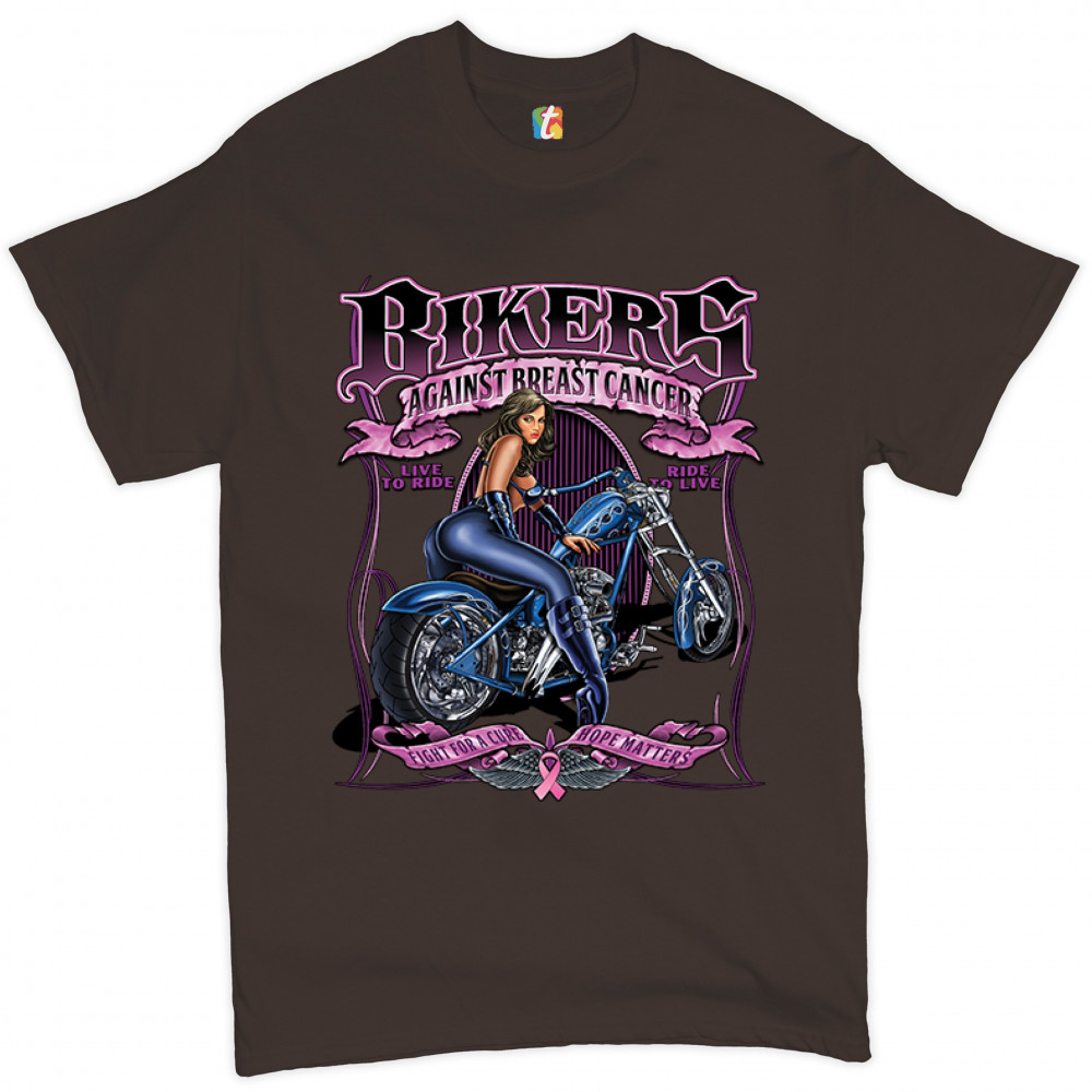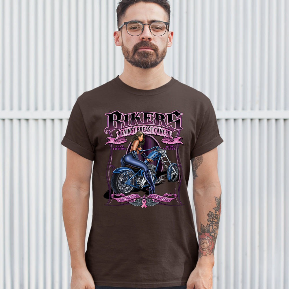 A print featuring a badass biker chick leaning on a chopper. The print says: "Bikers against breast cancer. Live to ride. Ride to live." At the bottom of the print there are two stripes with "fight for a cure, hope matters" written on them. Between the st