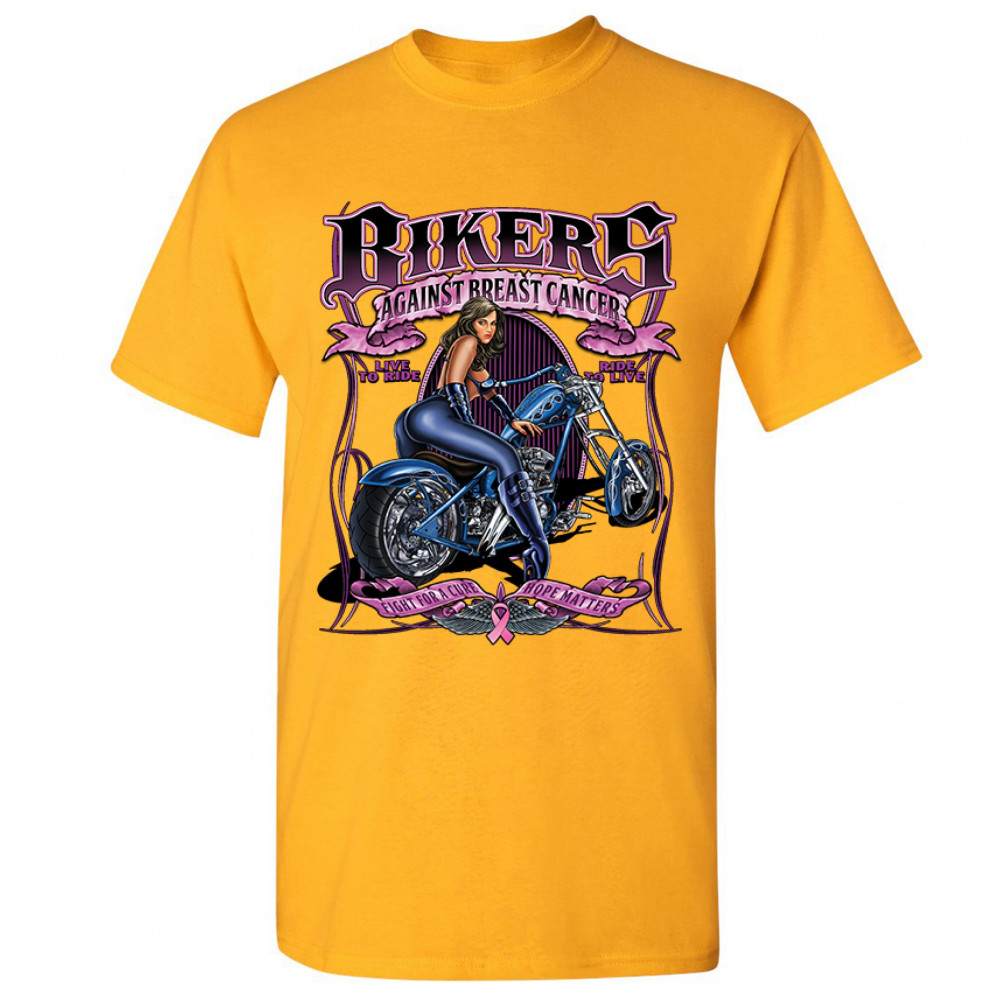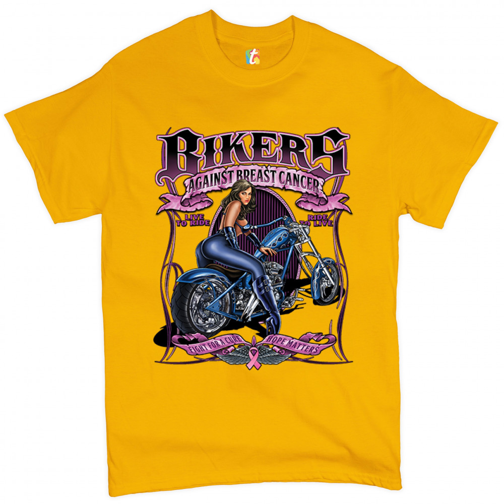 A print featuring a badass biker chick leaning on a chopper. The print says: "Bikers against breast cancer. Live to ride. Ride to live." At the bottom of the print there are two stripes with "fight for a cure, hope matters" written on them. Between the st