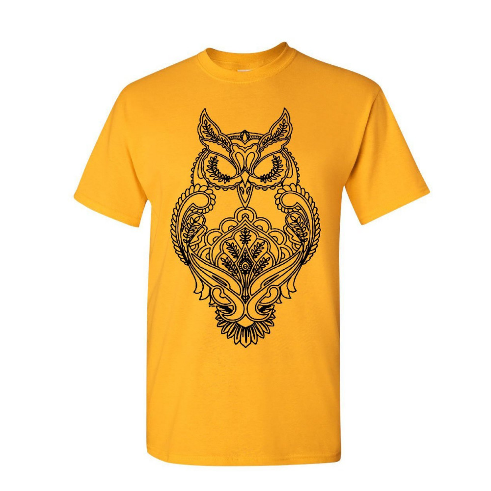 BLACK OWL HENNA STYLE t-shirt wildlife nature knowledge wisdom mens tee shirt yellow