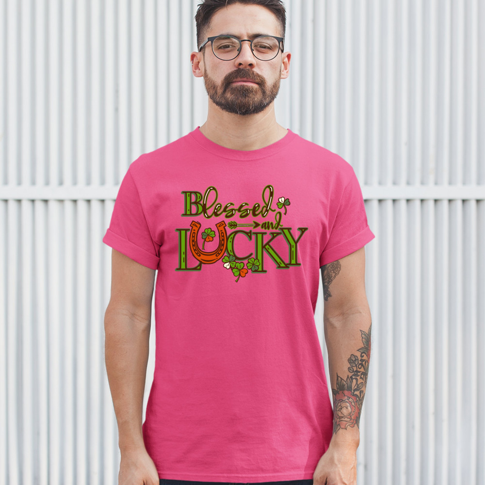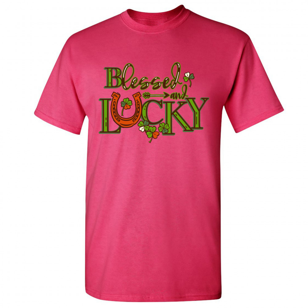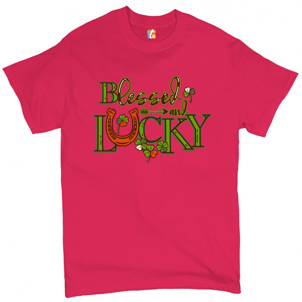 BLESSED AND LUCKY t-shirt st. patrick's day clover irish malarkey men's tee hot pink