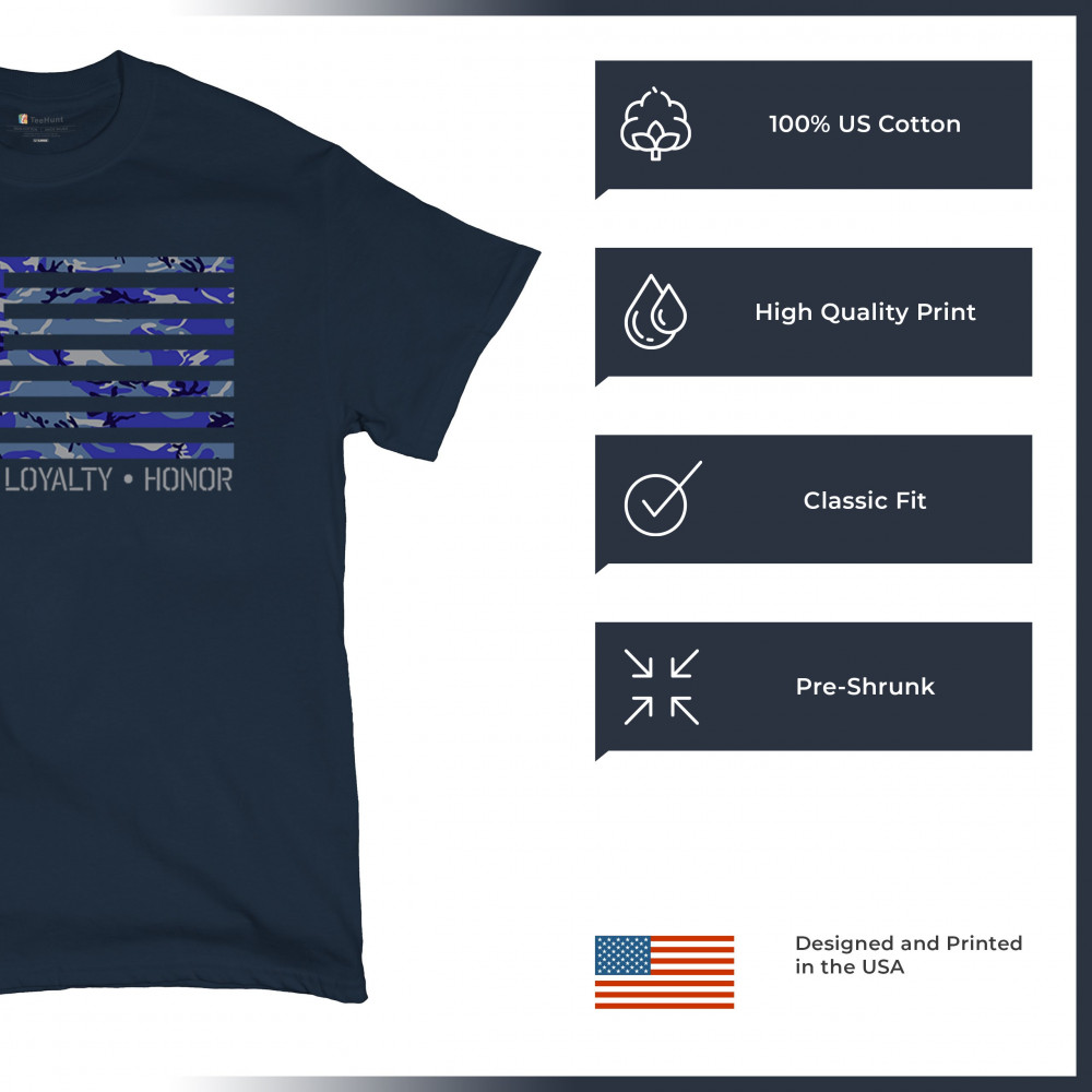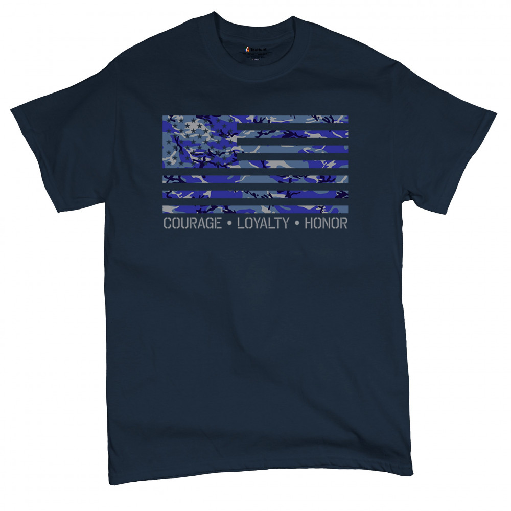 Patriotic shirt with blue camouflage USA flag and "Courage, Loyalty, Honor". Perfect for veterans and proud Americans. Ideal for Memorial Day and Veterans Day.