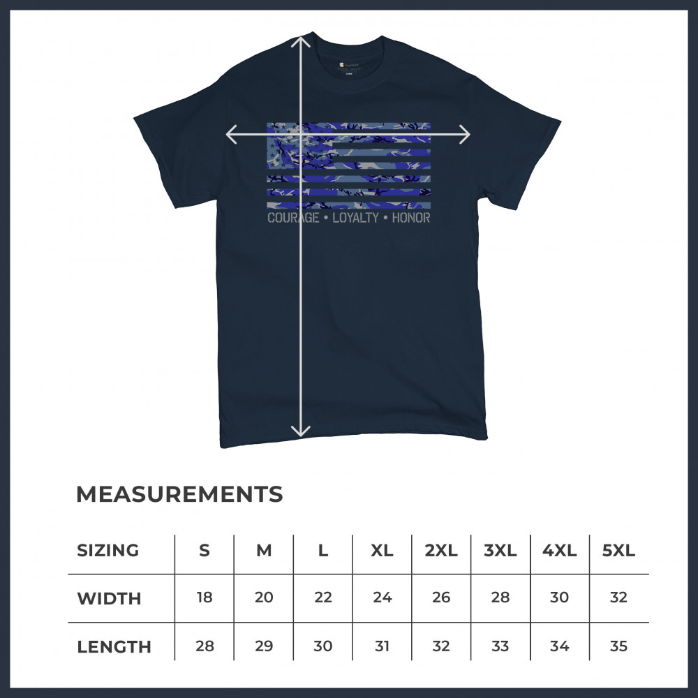 Celebrate your patriotism with this distinctive shirt featuring a blue camouflage USA flag and the inspiring words "Courage, Loyalty, Honor". This shirt is perfect for veterans, military families, and all proud Americans. Made from premium fabric, it ensures both comfort and durability for everyday wear. Wear it on Memorial Day, Veterans Day, or any day to honor the bravery and commitment of those who serve our nation. This shirt is not just an apparel choice, but a statement of pride and respect.