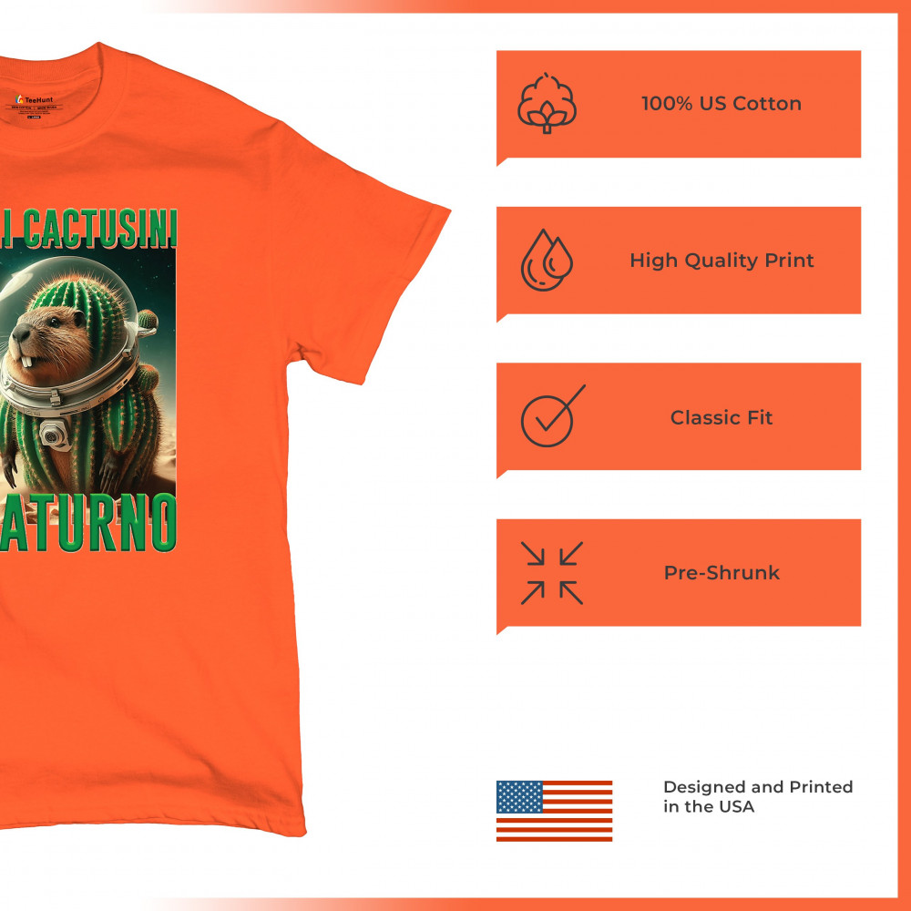 Blast off with Bobrini Cactusini Su Saturno—a cactus-beaver astronaut floating in pure brainrot. This cursed design blends space meme aesthetics, weirdcore fashion, viral Gen Z humor, and surreal animal mashups. It’s the ultimate tee for lovers of ironic internet chaos and absurdist TikTok trends.
