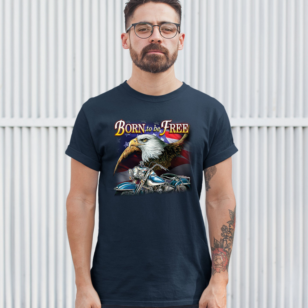 BORN TO BE FREE t-shirt american bald eagle chopper biker patriotic men's tee navy blue