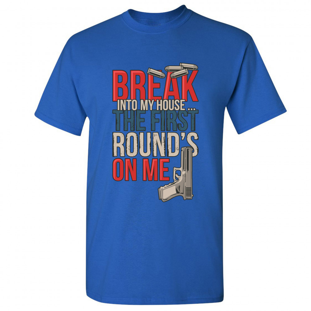 BREAK INTO MY HOUSE.. THE FIRST ROUND'S ON ME t-shirt 2nd amendment men's tee royal blue