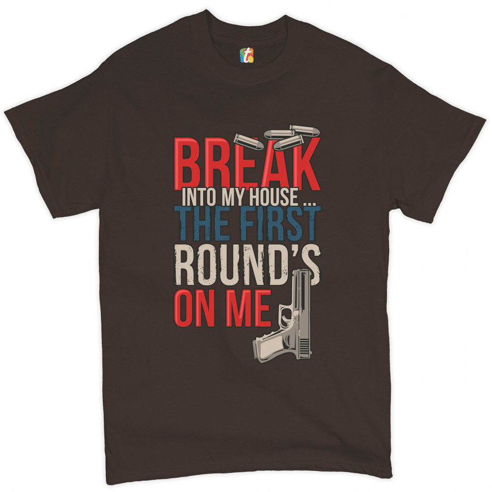 BREAK INTO MY HOUSE.. THE FIRST ROUND'S ON ME t-shirt 2nd amendment men's tee brown