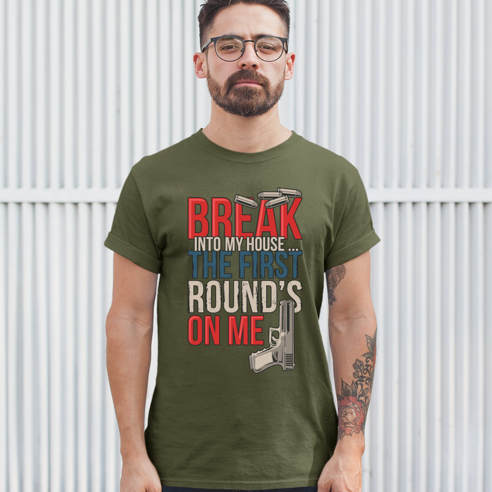 BREAK INTO MY HOUSE.. THE FIRST ROUND'S ON ME t-shirt 2nd amendment men's tee military green