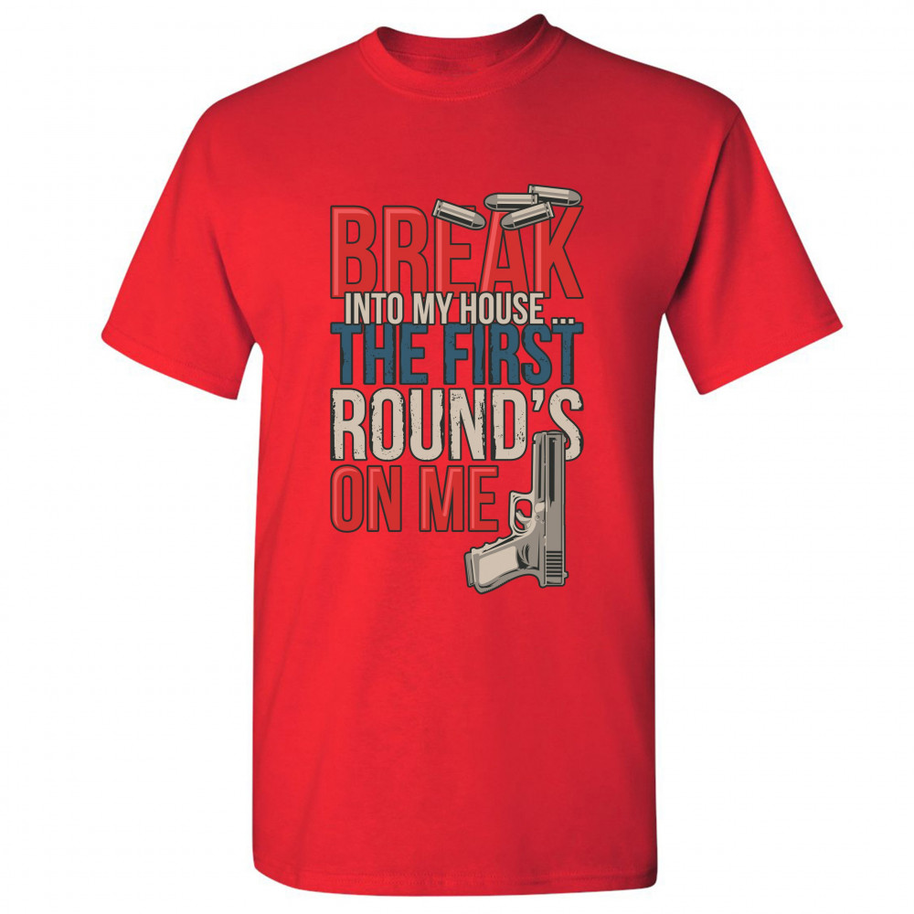 BREAK INTO MY HOUSE.. THE FIRST ROUND'S ON ME t-shirt 2nd amendment men's tee red
