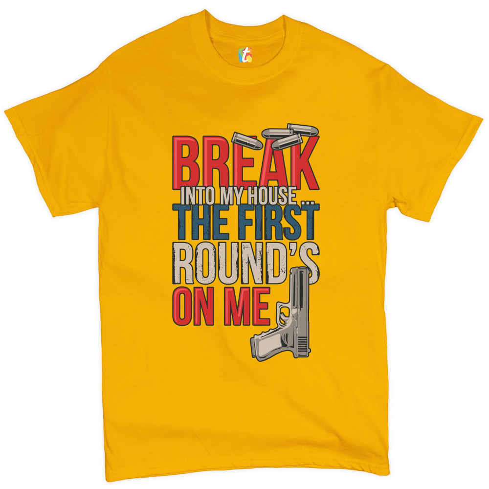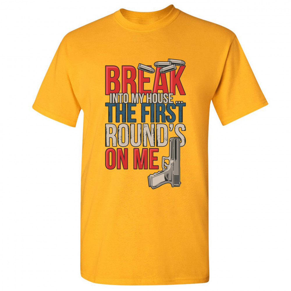 BREAK INTO MY HOUSE.. THE FIRST ROUND'S ON ME t-shirt 2nd amendment men's tee yellow