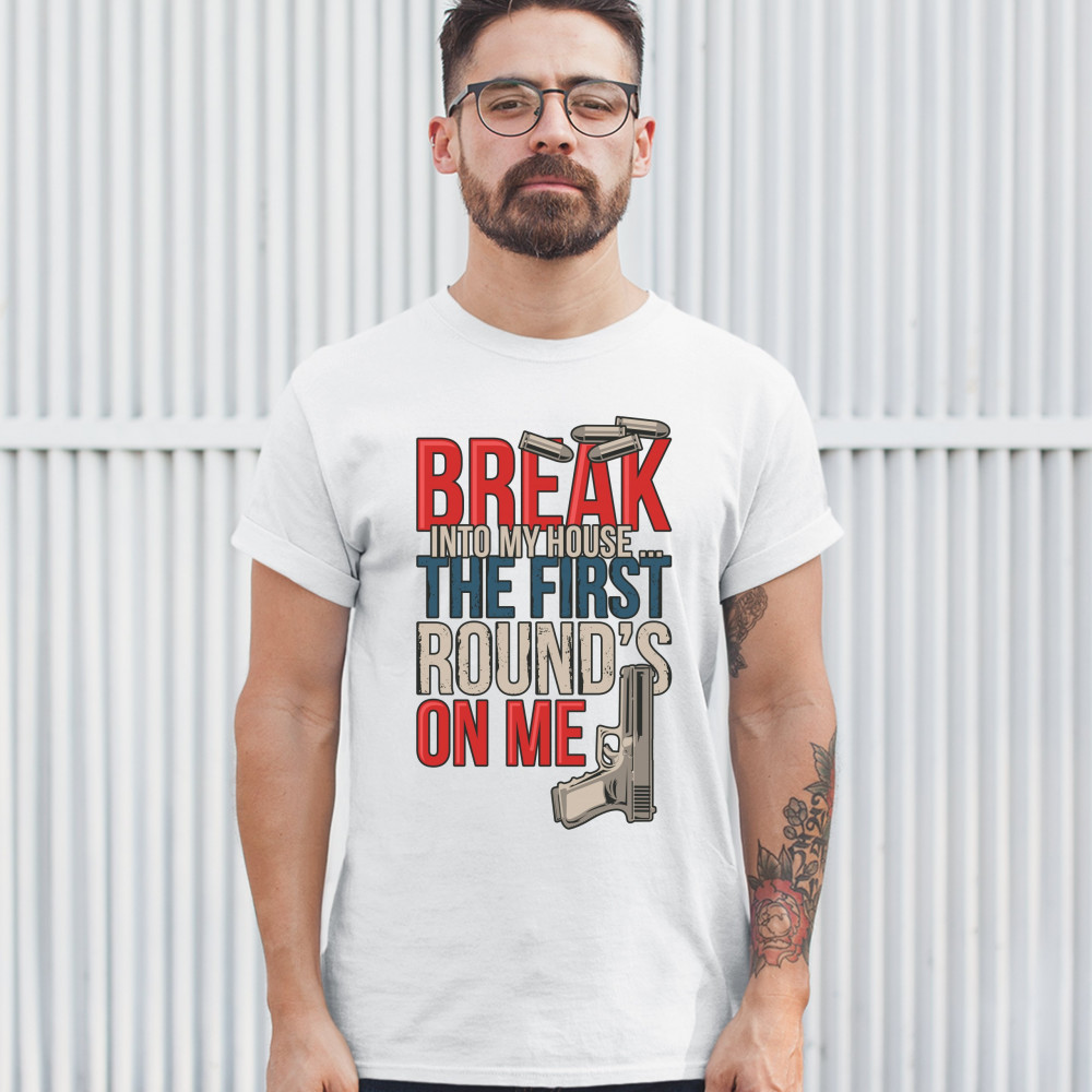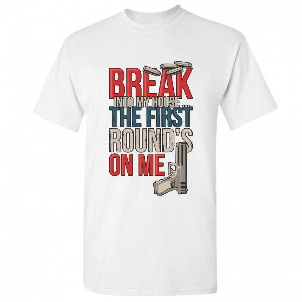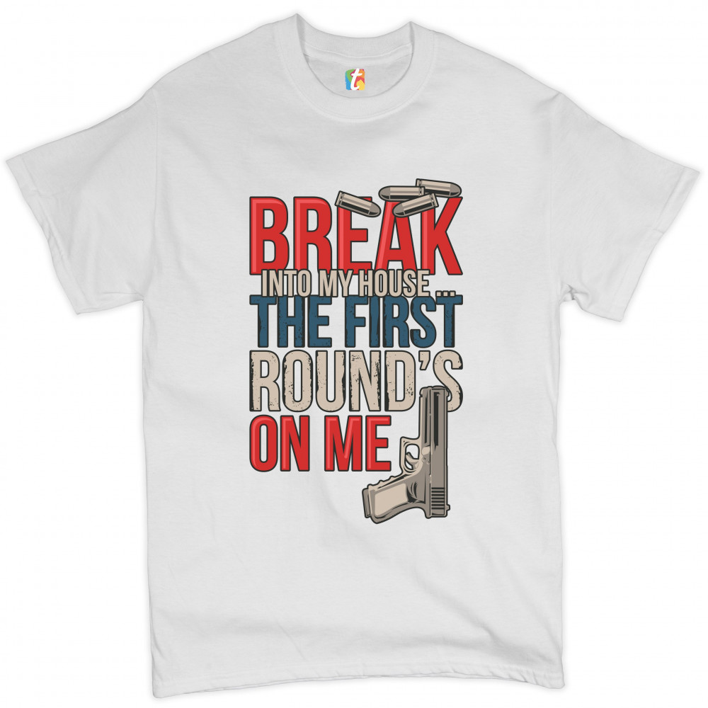 BREAK INTO MY HOUSE.. THE FIRST ROUND'S ON ME t-shirt 2nd amendment men's tee white