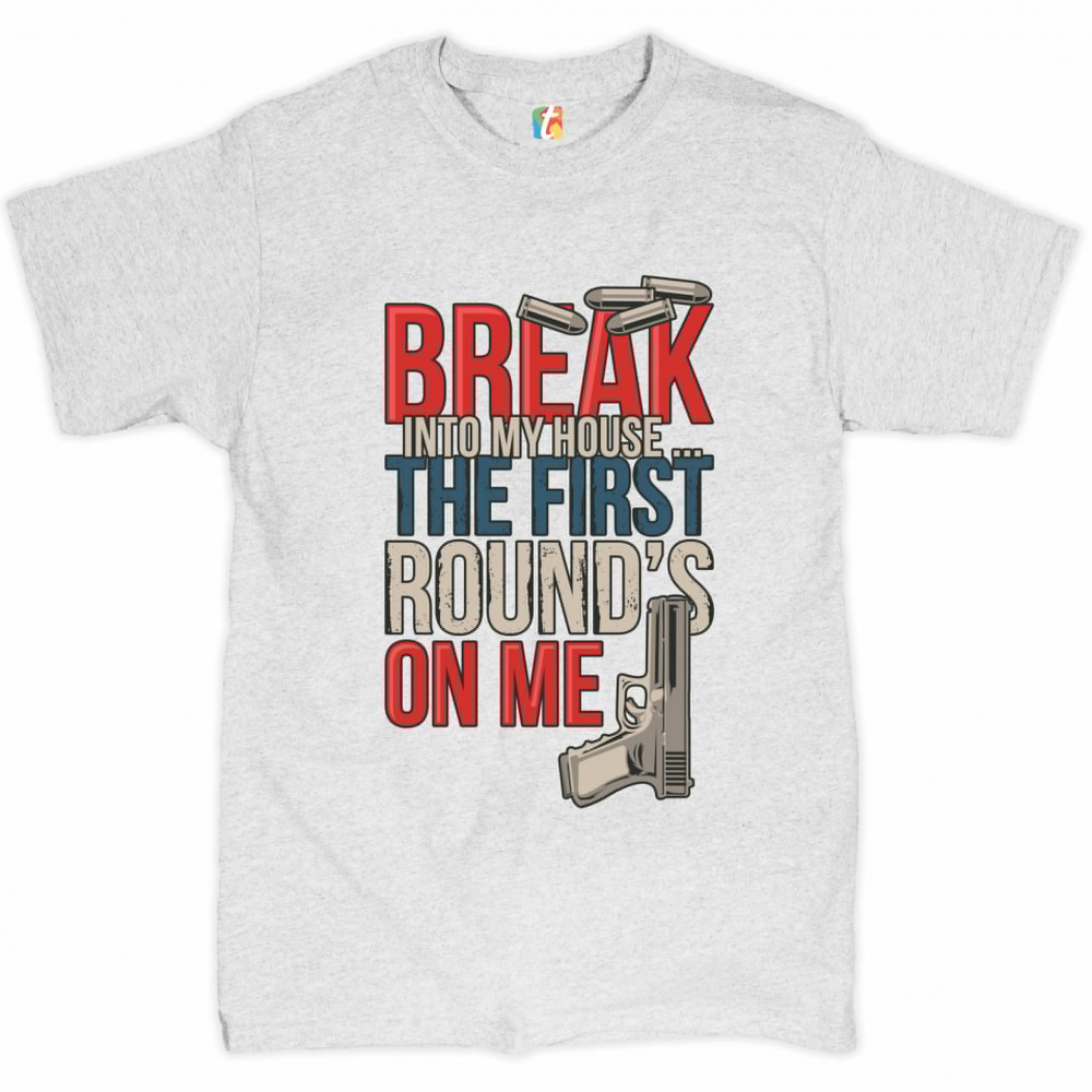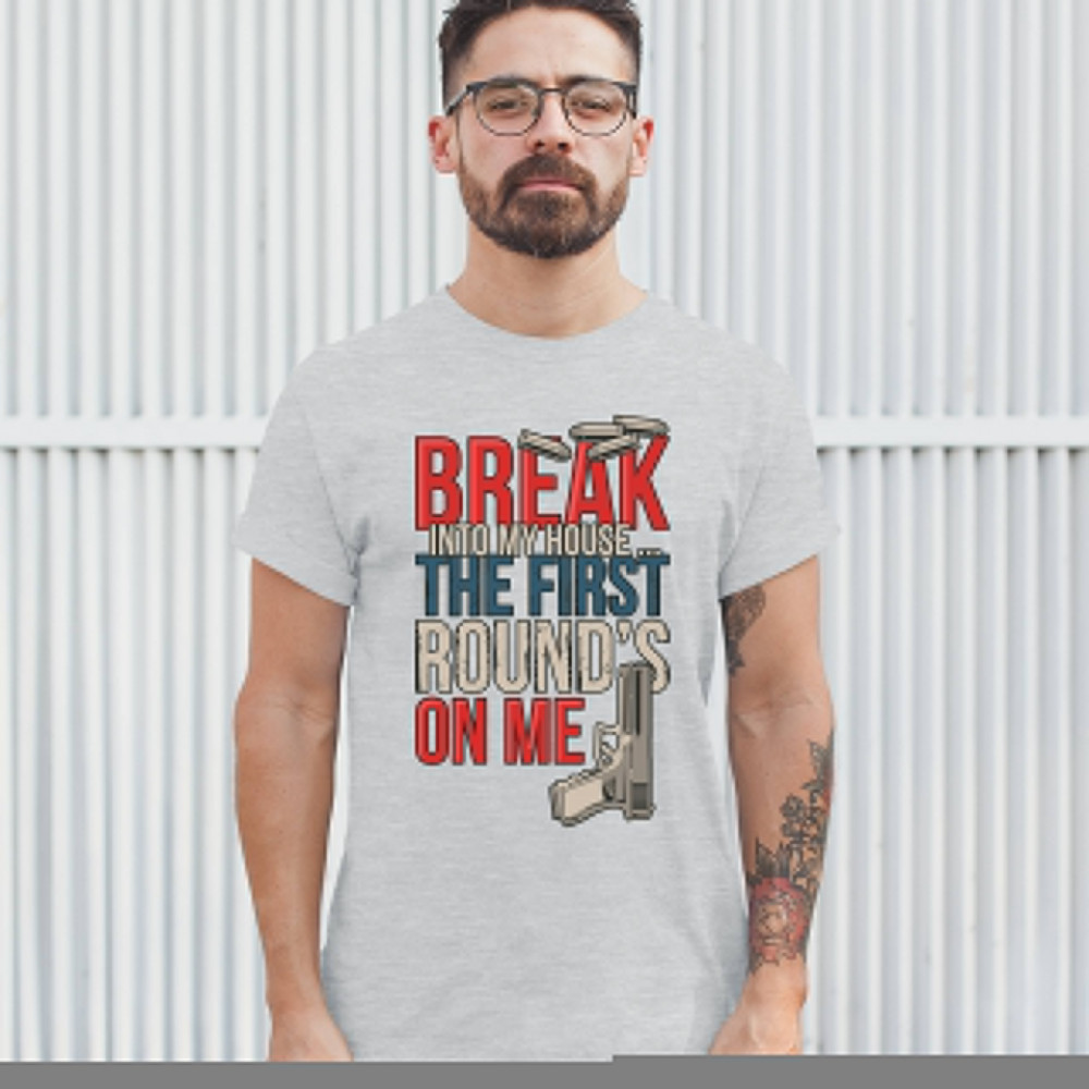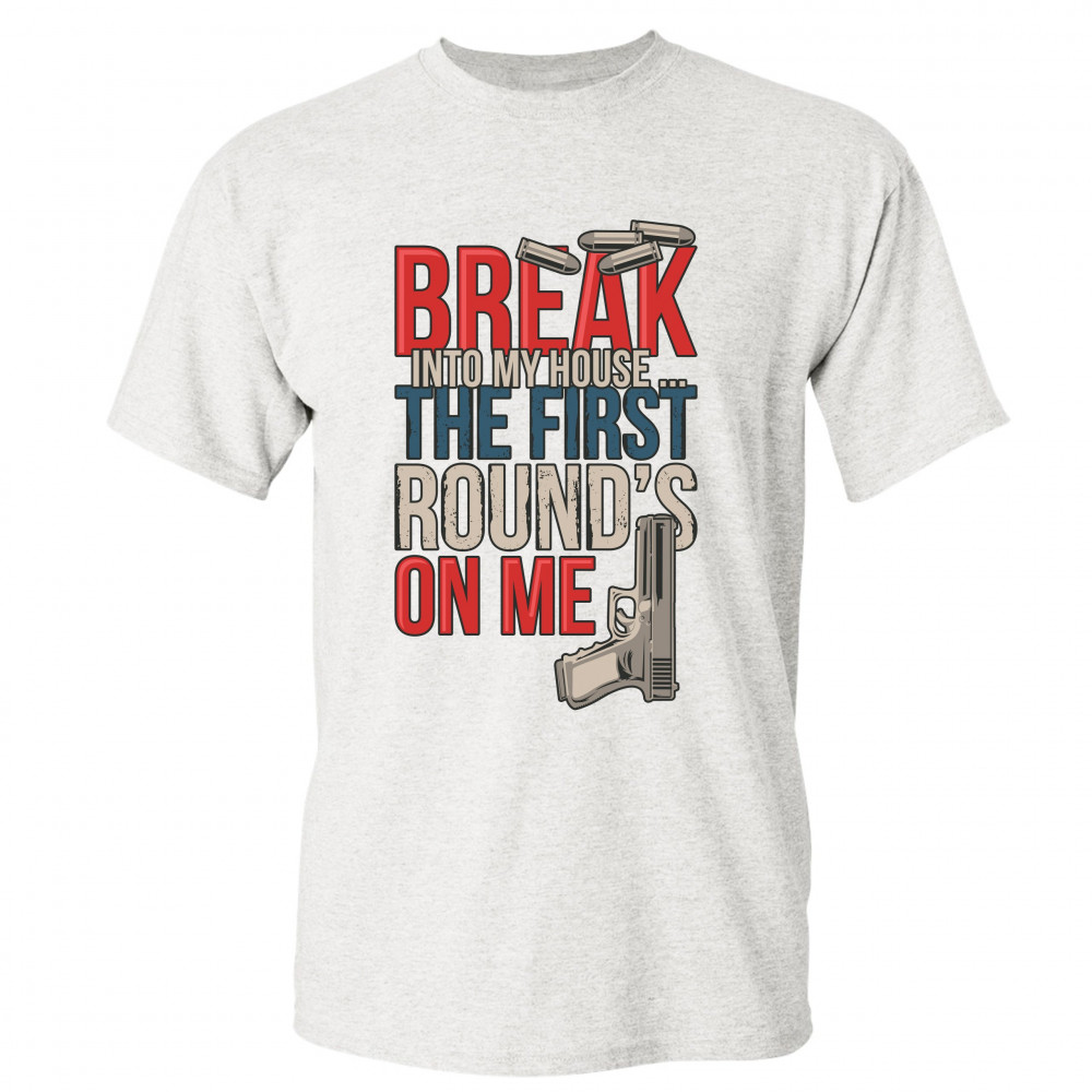 BREAK INTO MY HOUSE.. THE FIRST ROUND'S ON ME t-shirt 2nd amendment men's tee ash gray