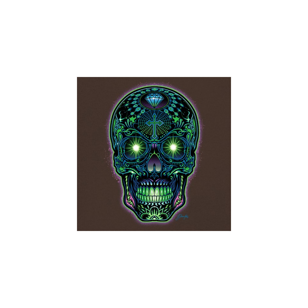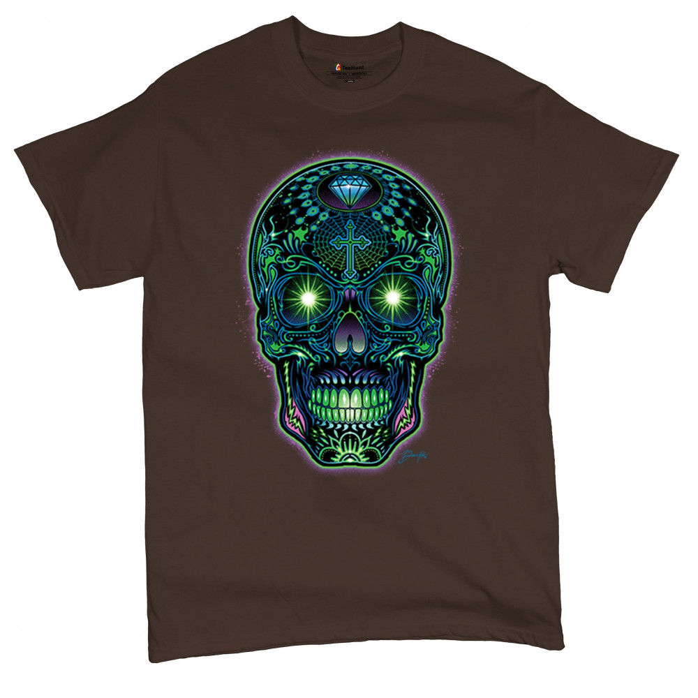 This electrified sugar skull design glows with neon energy and intricate details. Featuring green eyes, radiant cross, diamond, spider web, and vivid colors, it's a bold mash-up of psychedelic art, Day of the Dead tradition, and rave culture. A vibrant design perfect for skull fans and spiritual rebels alike.