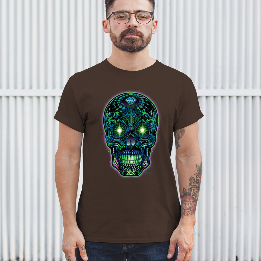 Electrified sugar skull with glowing green eyes, neon cross and diamond, perfect for rave lovers, skull art fans, and Day of the Dead style.