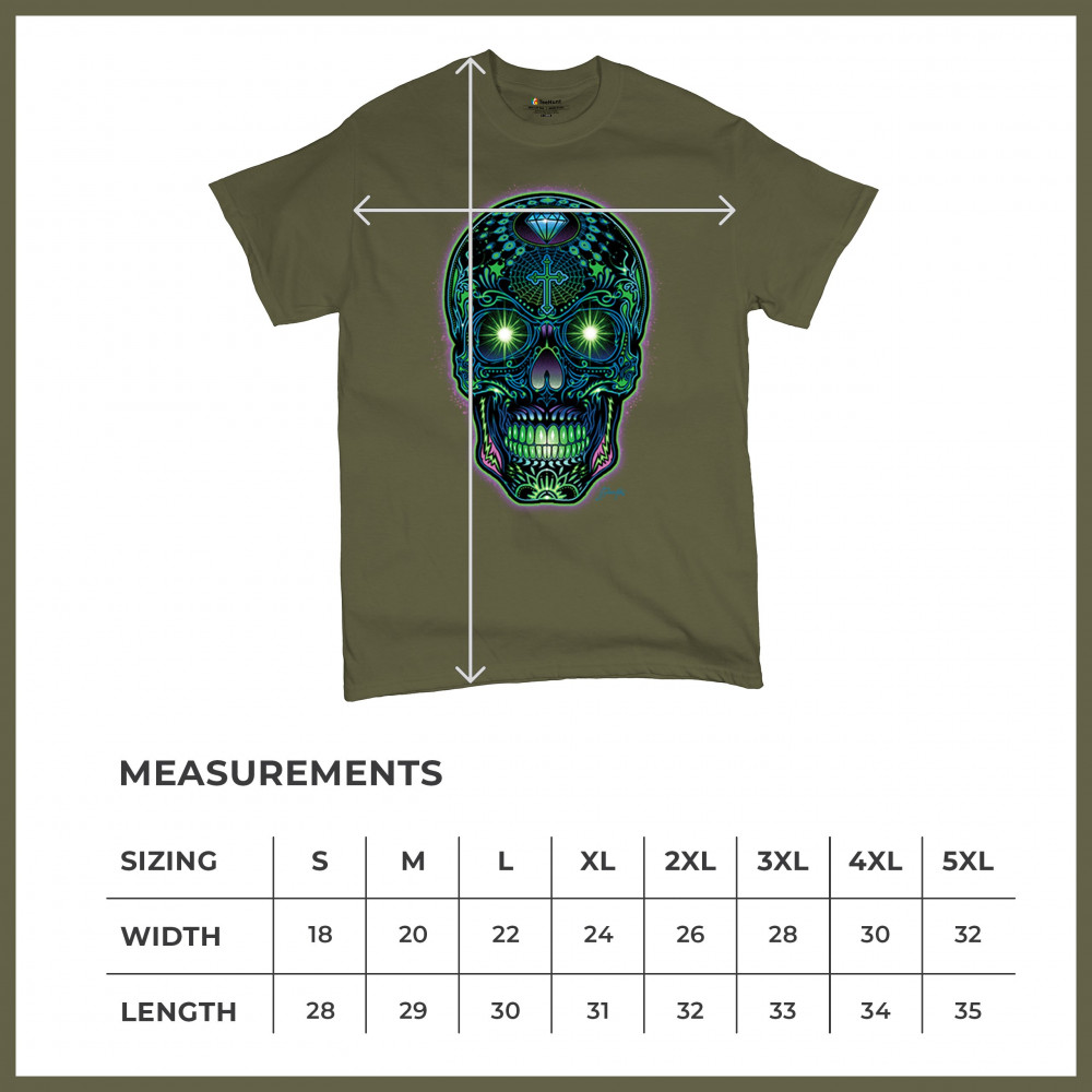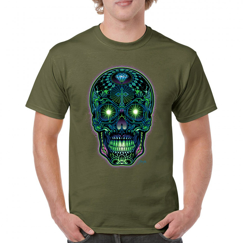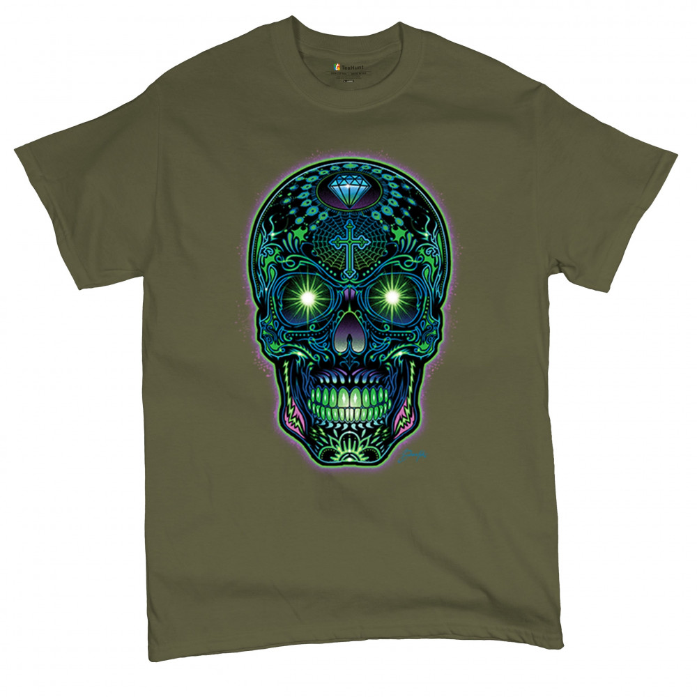 This electrified sugar skull design glows with neon energy and intricate details. Featuring green eyes, radiant cross, diamond, spider web, and vivid colors, it's a bold mash-up of psychedelic art, Day of the Dead tradition, and rave culture. A vibrant design perfect for skull fans and spiritual rebels alike.