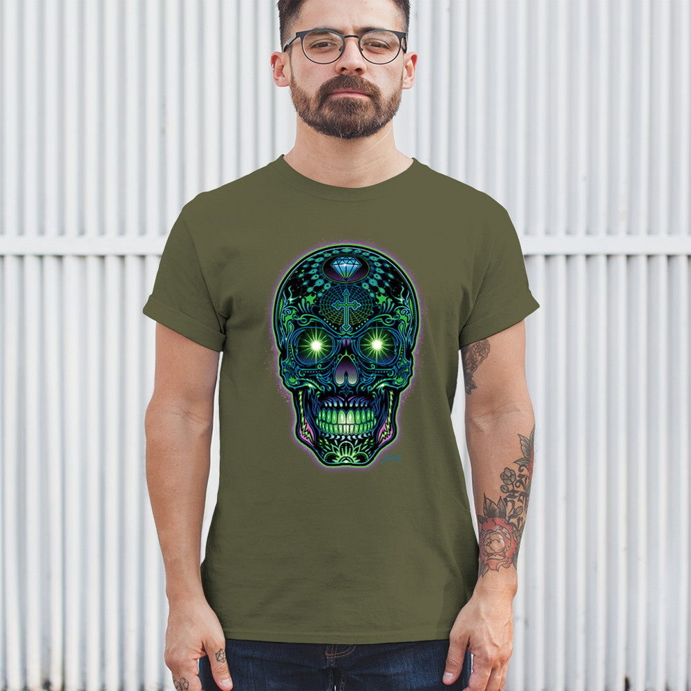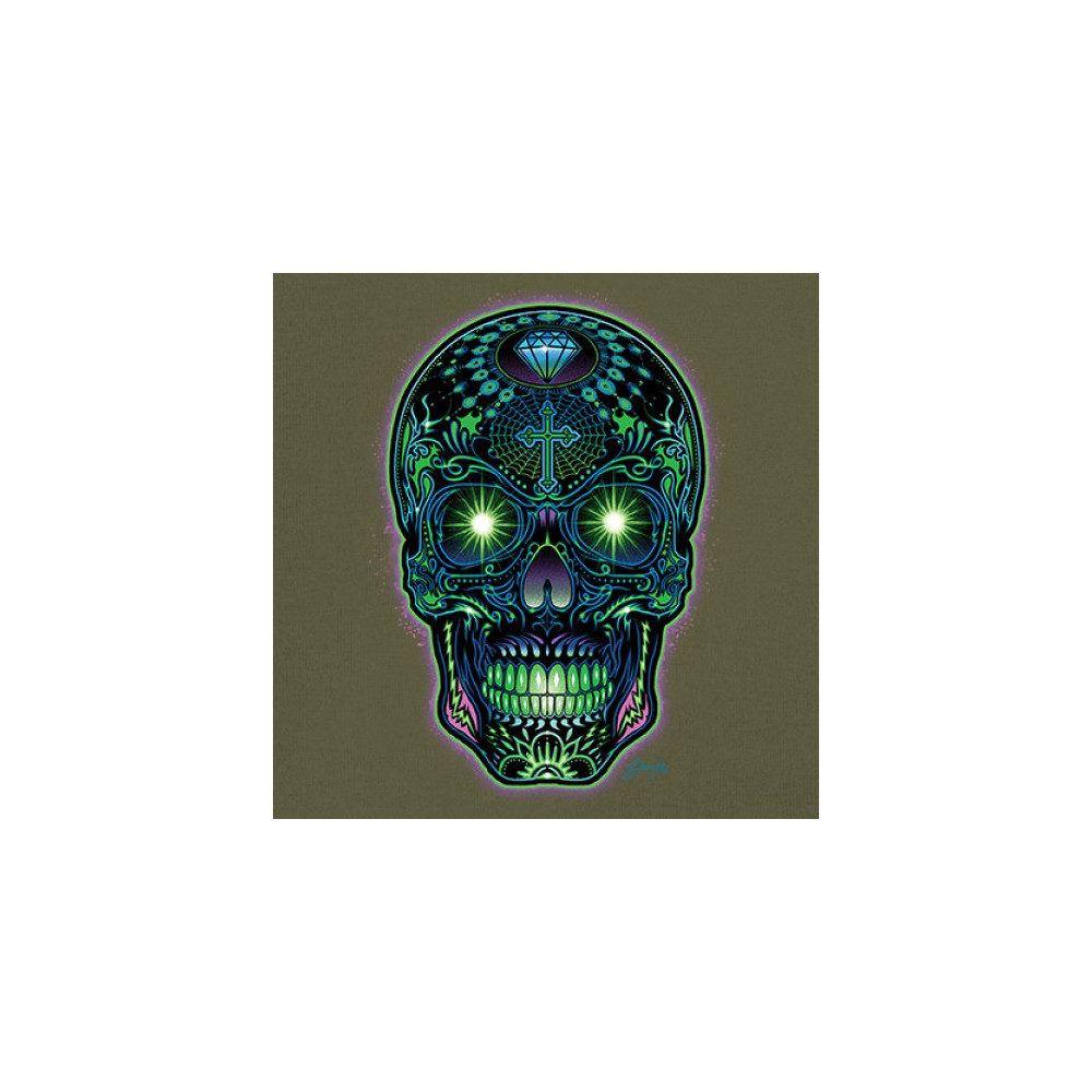 Electrified sugar skull with glowing green eyes, neon cross and diamond, perfect for rave lovers, skull art fans, and Day of the Dead style.