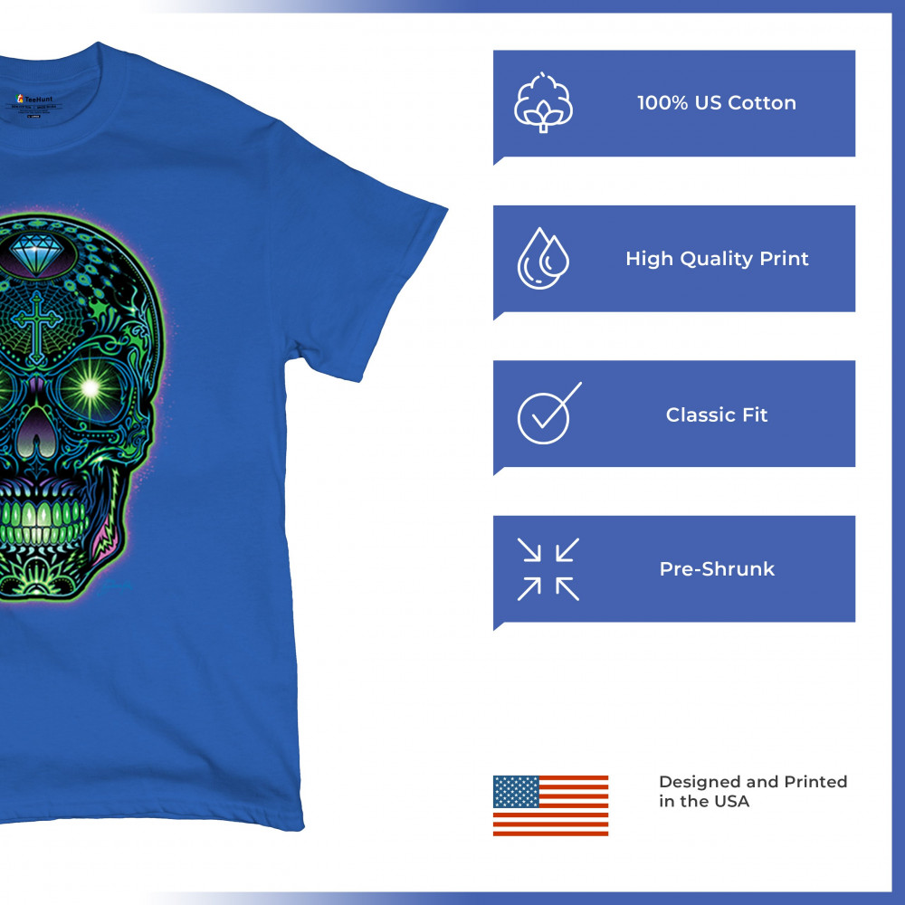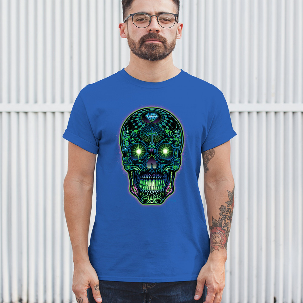 This electrified sugar skull design glows with neon energy and intricate details. Featuring green eyes, radiant cross, diamond, spider web, and vivid colors, it's a bold mash-up of psychedelic art, Day of the Dead tradition, and rave culture. A vibrant design perfect for skull fans and spiritual rebels alike.