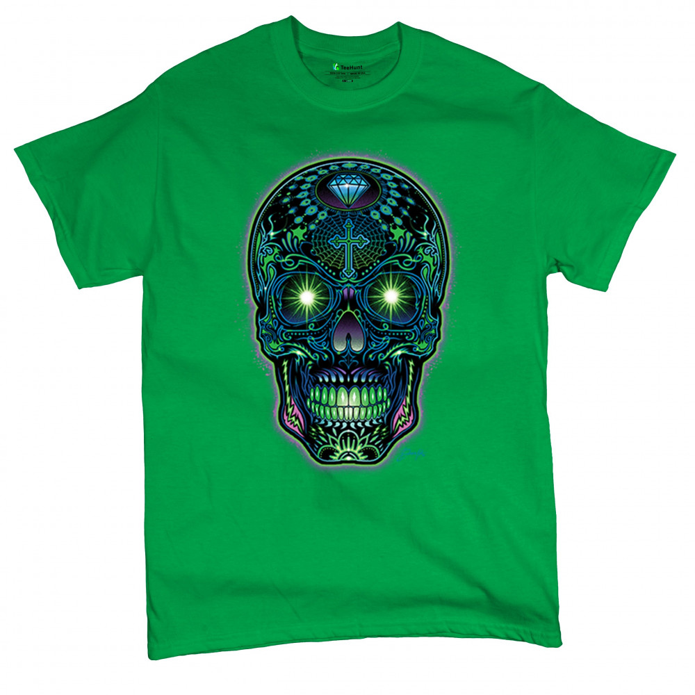 This electrified sugar skull design glows with neon energy and intricate details. Featuring green eyes, radiant cross, diamond, spider web, and vivid colors, it's a bold mash-up of psychedelic art, Day of the Dead tradition, and rave culture. A vibrant design perfect for skull fans and spiritual rebels alike.