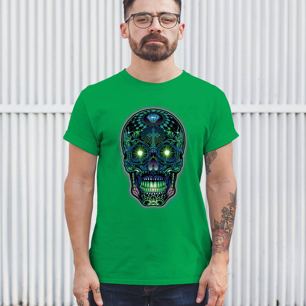 Electrified sugar skull with glowing green eyes, neon cross and diamond, perfect for rave lovers, skull art fans, and Day of the Dead style.