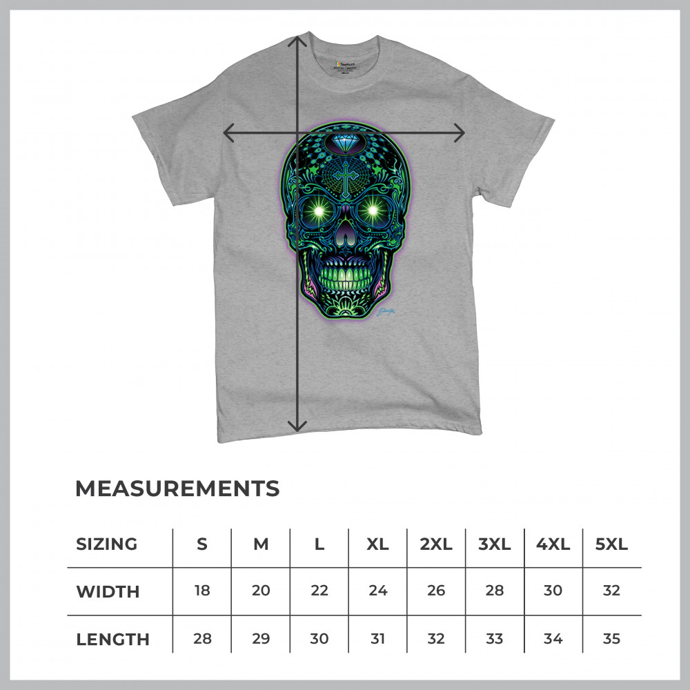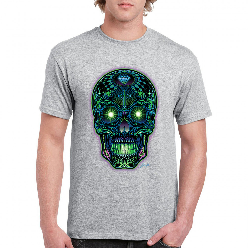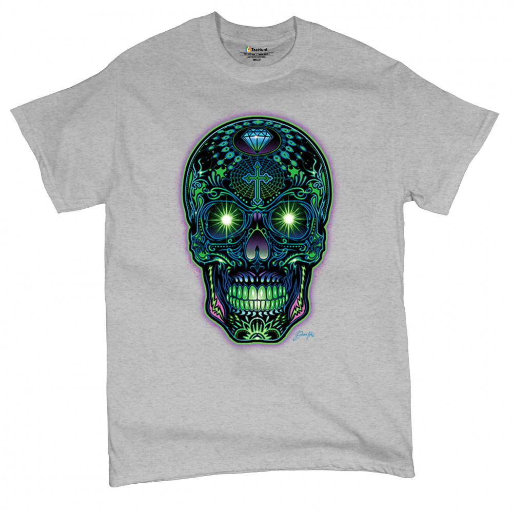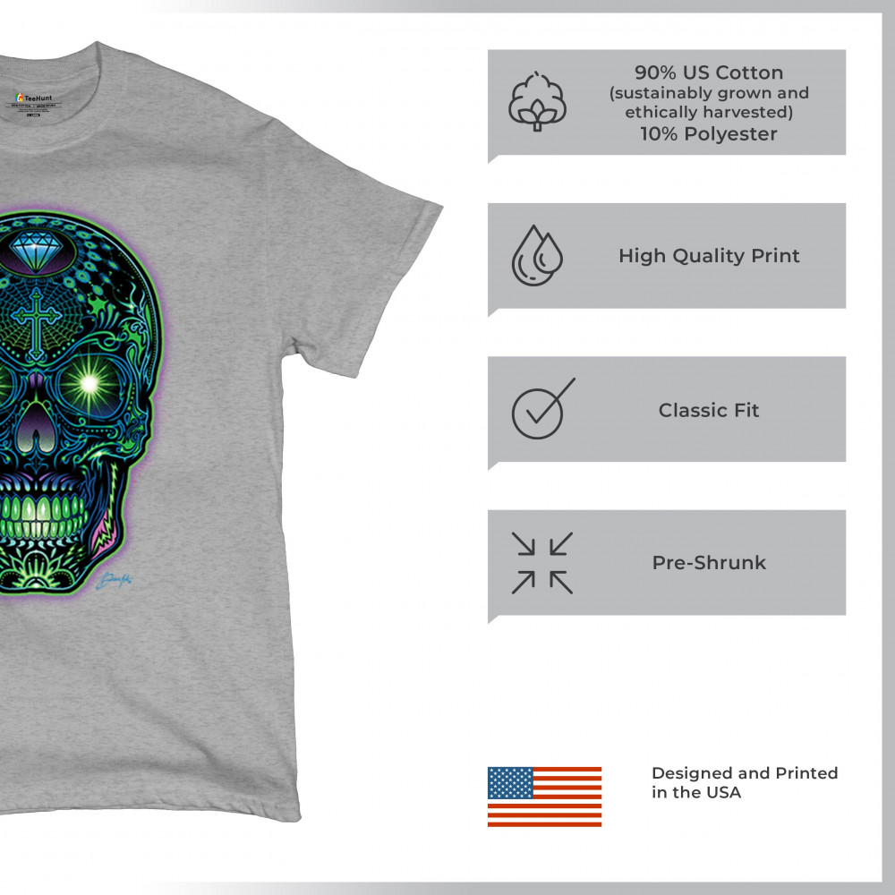 This electrified sugar skull design glows with neon energy and intricate details. Featuring green eyes, radiant cross, diamond, spider web, and vivid colors, it's a bold mash-up of psychedelic art, Day of the Dead tradition, and rave culture. A vibrant design perfect for skull fans and spiritual rebels alike.