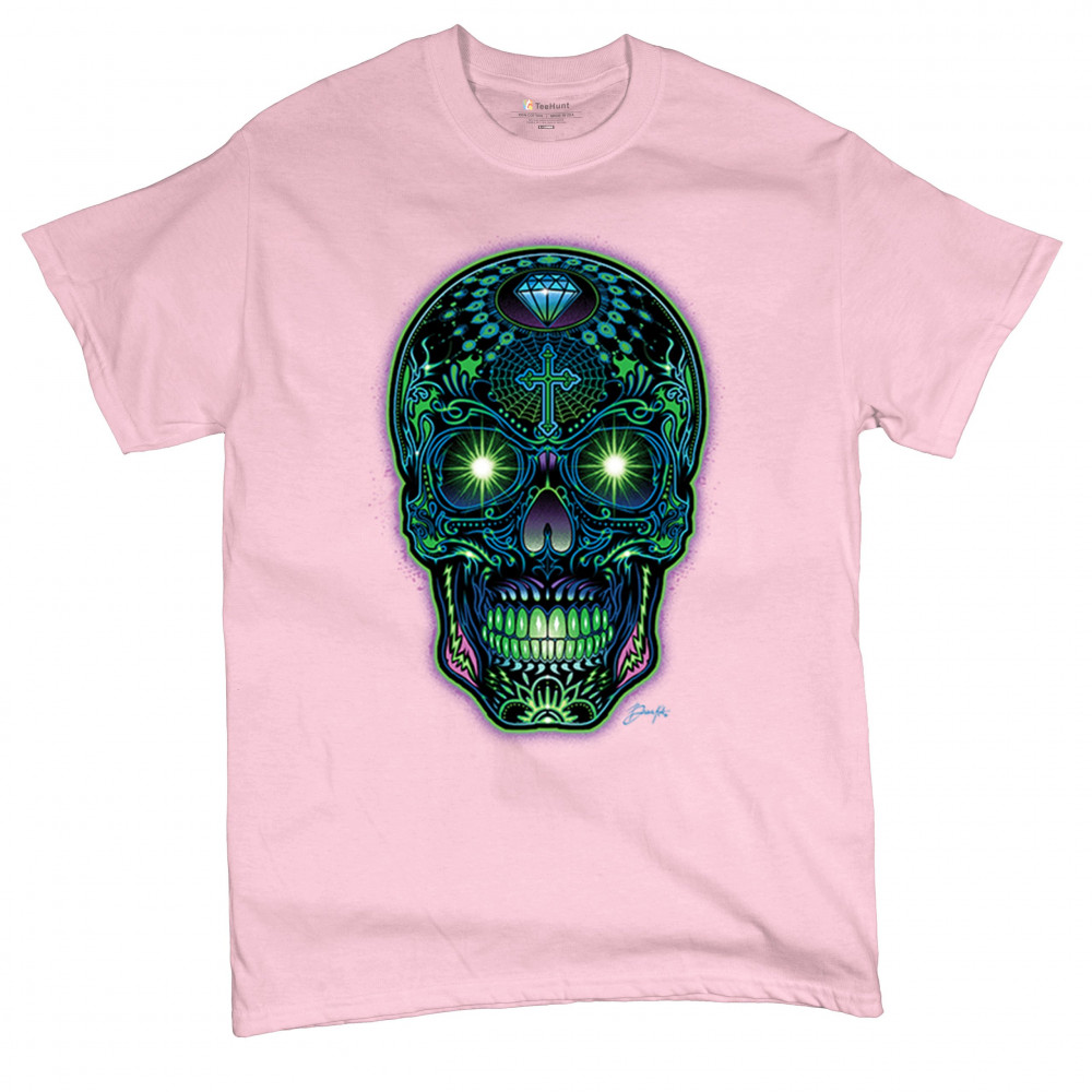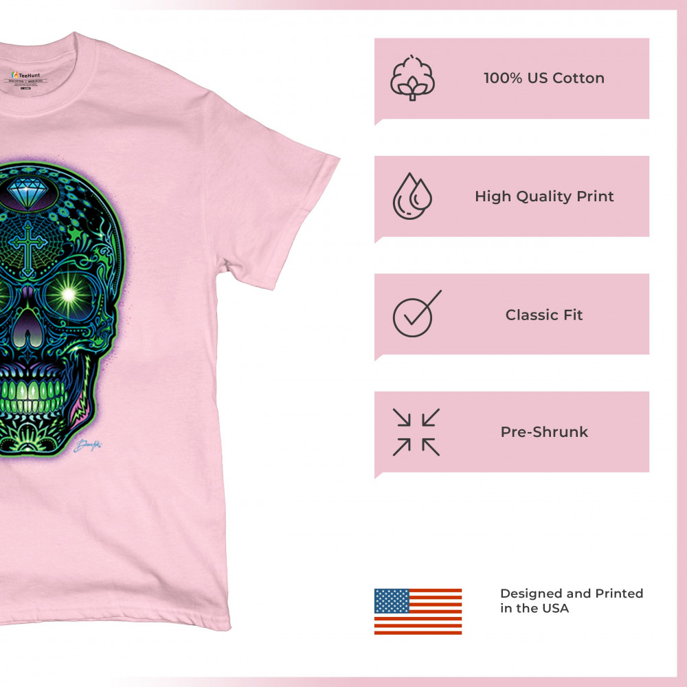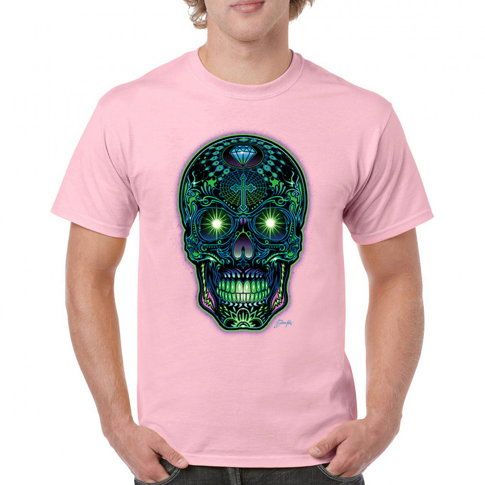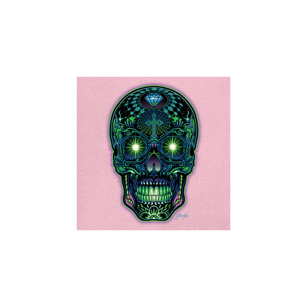 This electrified sugar skull design glows with neon energy and intricate details. Featuring green eyes, radiant cross, diamond, spider web, and vivid colors, it's a bold mash-up of psychedelic art, Day of the Dead tradition, and rave culture. A vibrant design perfect for skull fans and spiritual rebels alike.