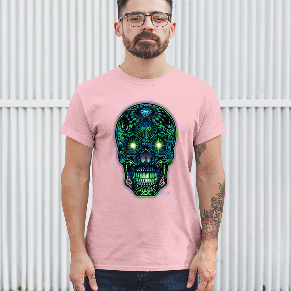Electrified sugar skull with glowing green eyes, neon cross and diamond, perfect for rave lovers, skull art fans, and Day of the Dead style.