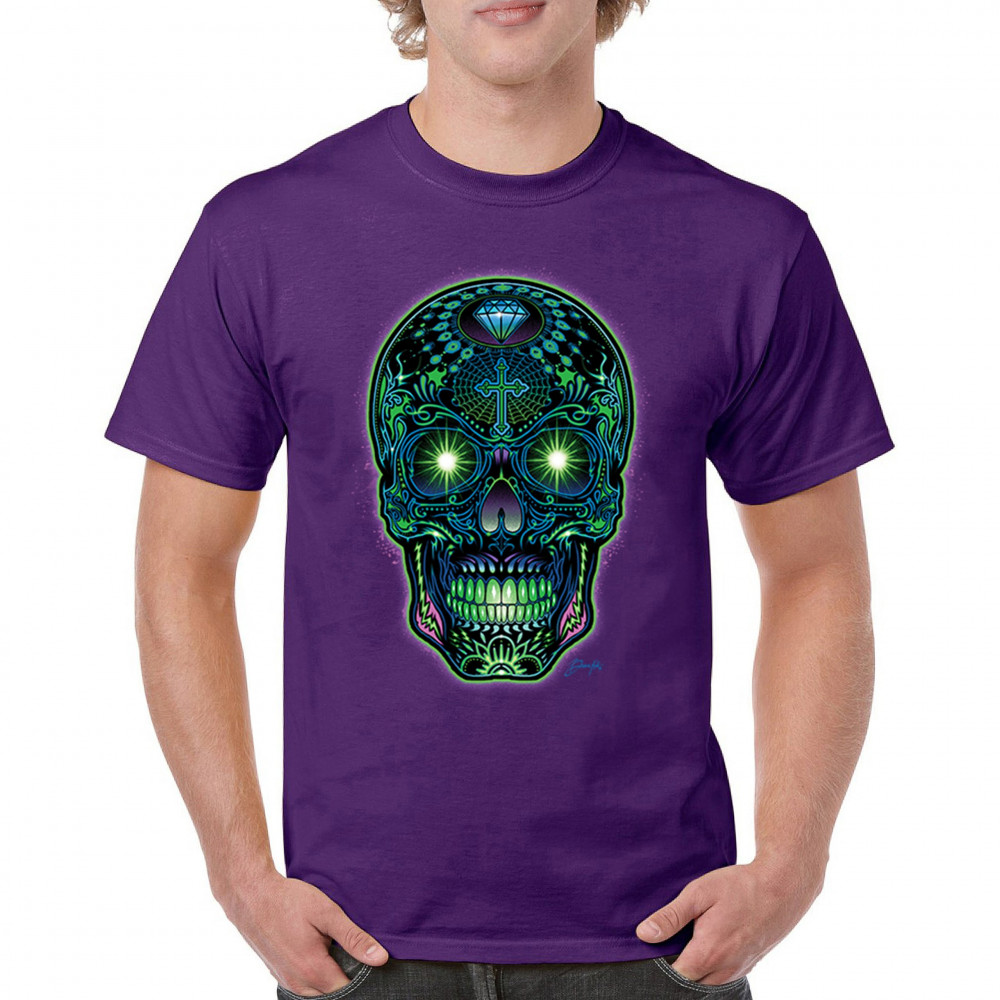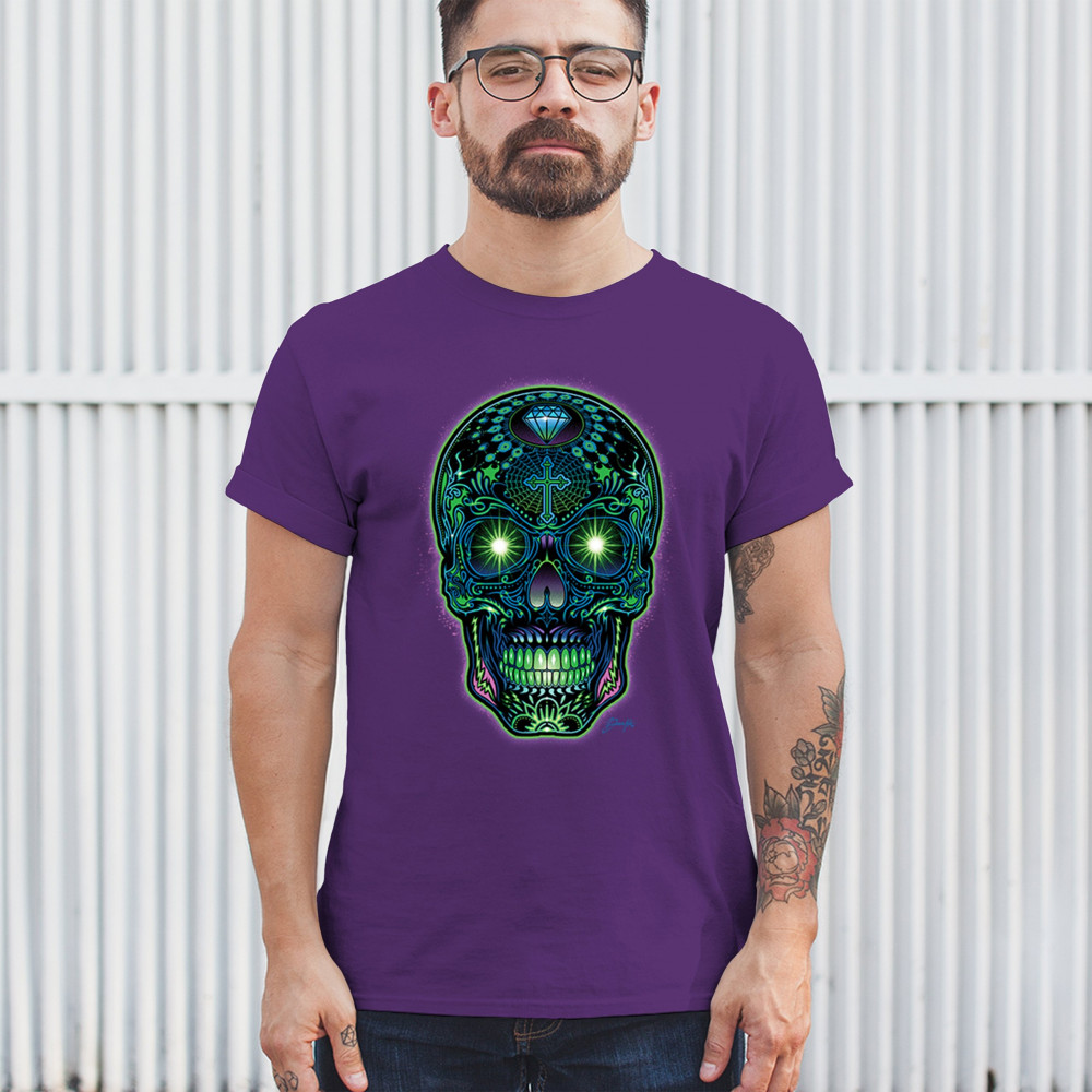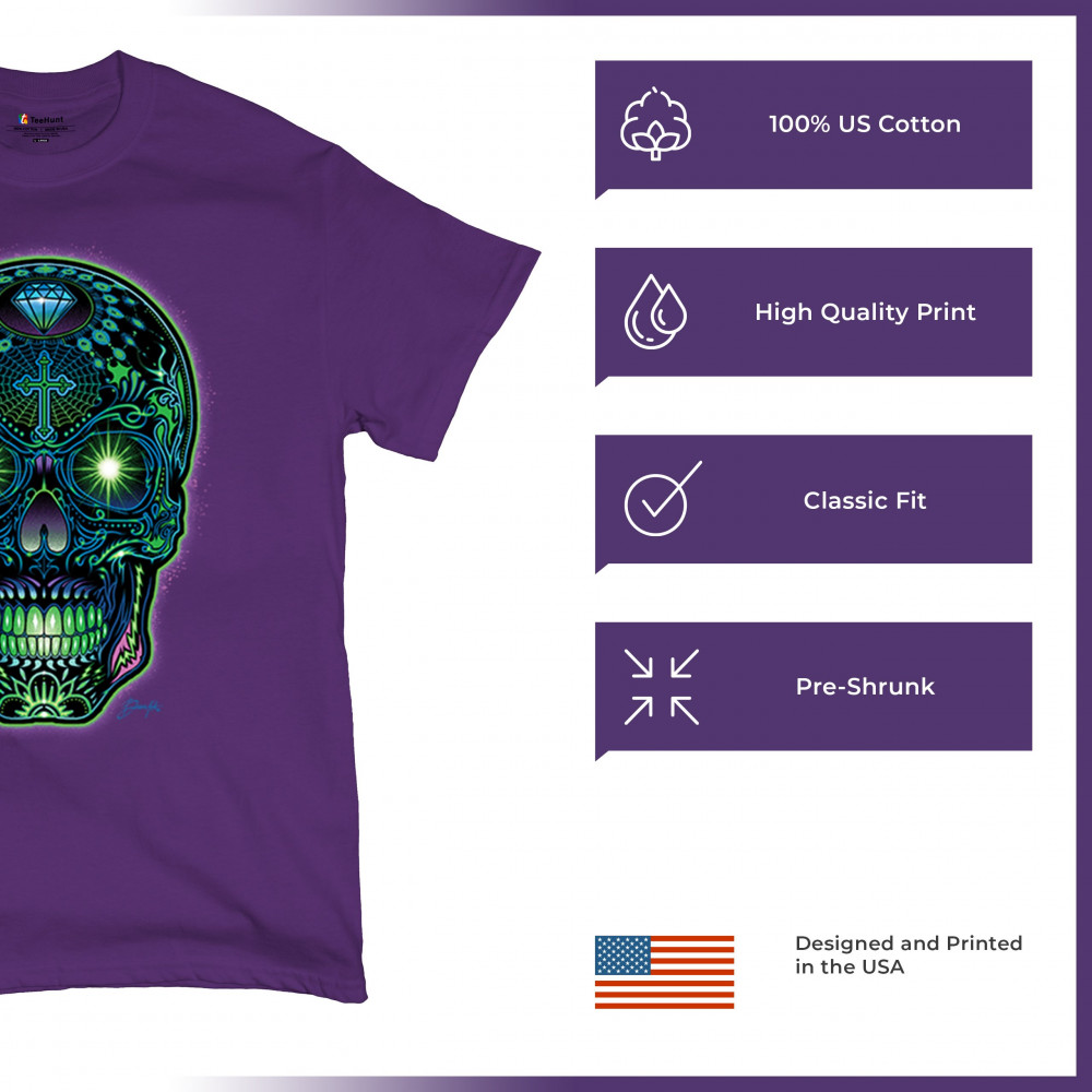 This electrified sugar skull design glows with neon energy and intricate details. Featuring green eyes, radiant cross, diamond, spider web, and vivid colors, it's a bold mash-up of psychedelic art, Day of the Dead tradition, and rave culture. A vibrant design perfect for skull fans and spiritual rebels alike.