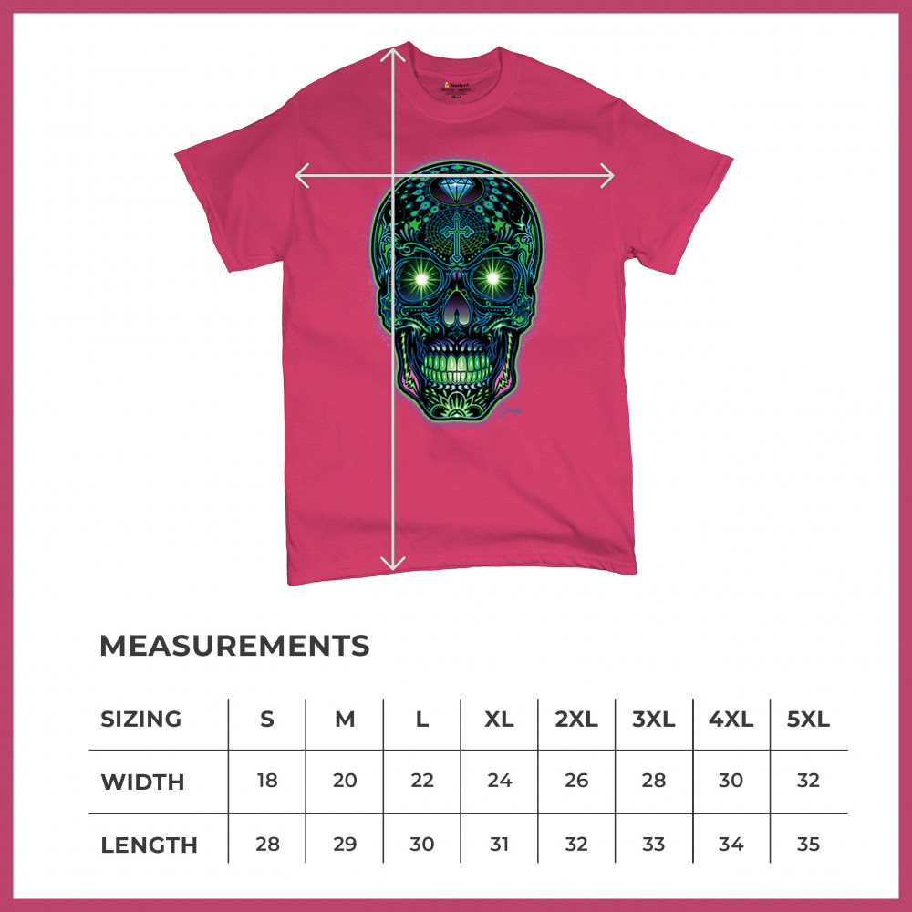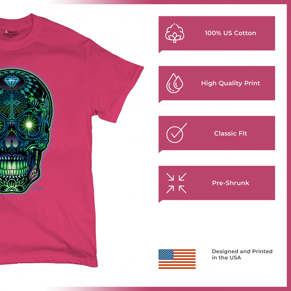 This electrified sugar skull design glows with neon energy and intricate details. Featuring green eyes, radiant cross, diamond, spider web, and vivid colors, it's a bold mash-up of psychedelic art, Day of the Dead tradition, and rave culture. A vibrant design perfect for skull fans and spiritual rebels alike.
