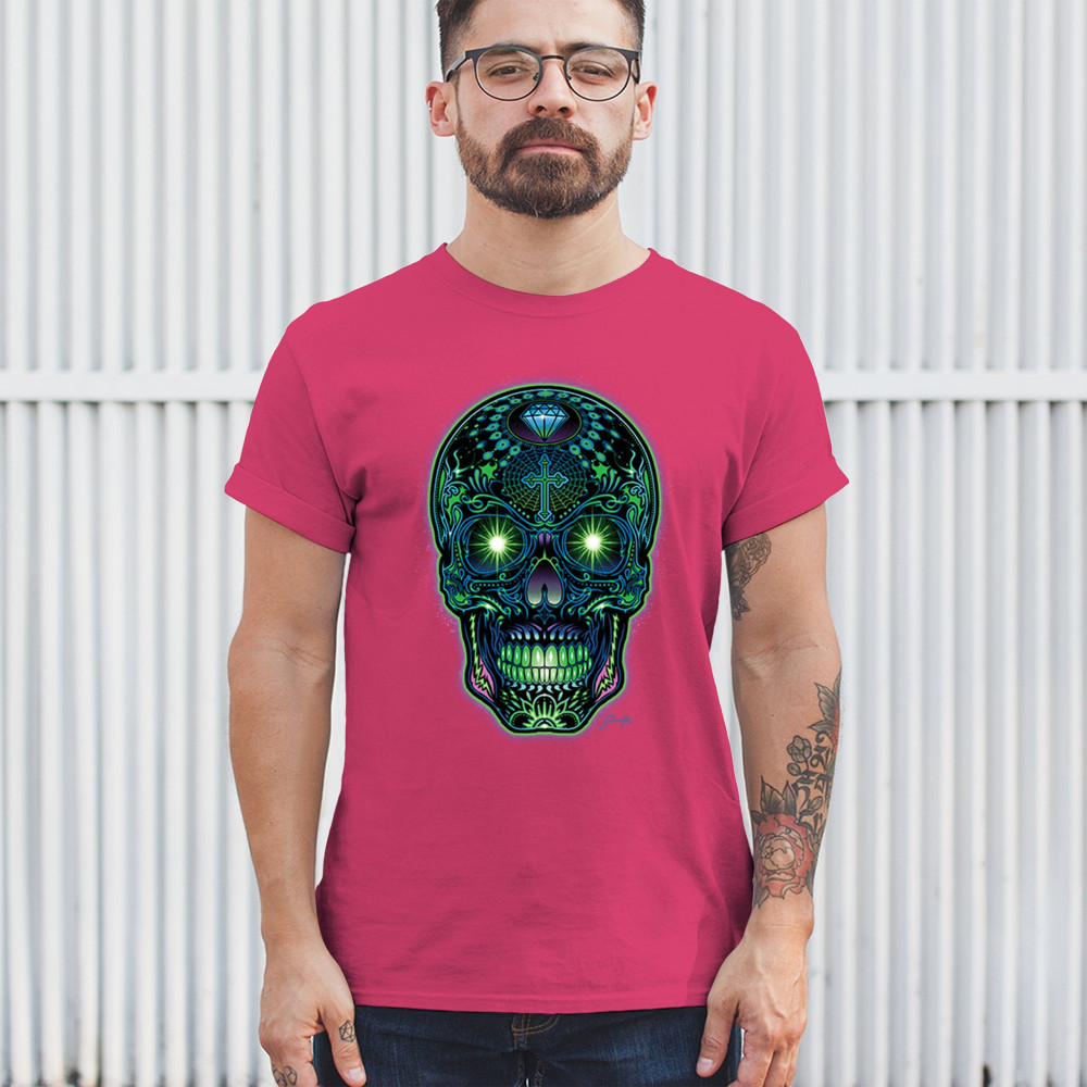 Electrified sugar skull with glowing green eyes, neon cross and diamond, perfect for rave lovers, skull art fans, and Day of the Dead style.