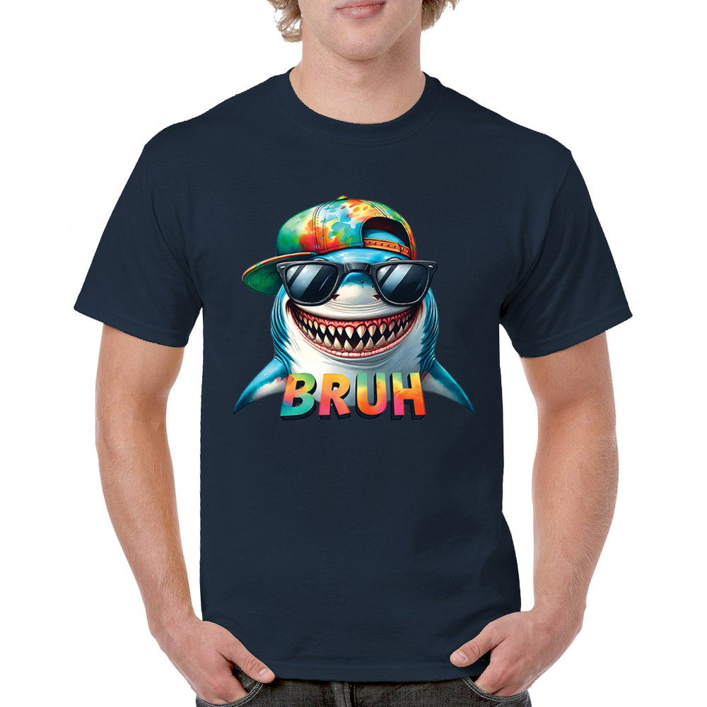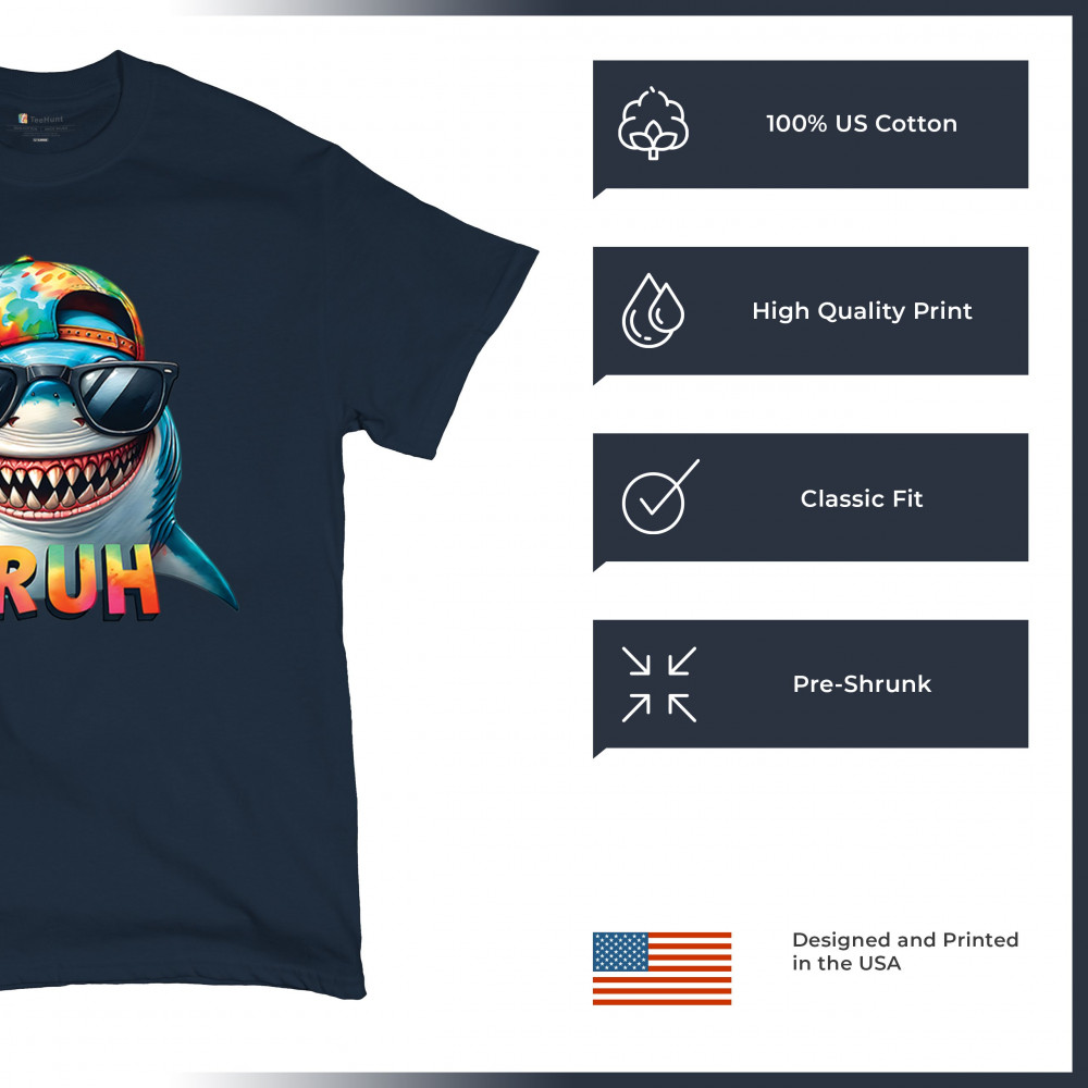 Bruh Shark meme shirt with Gen Z humor, cartoon shark design, summer beach vibes, Sigma Aura, and Italian Brainrot internet humor.