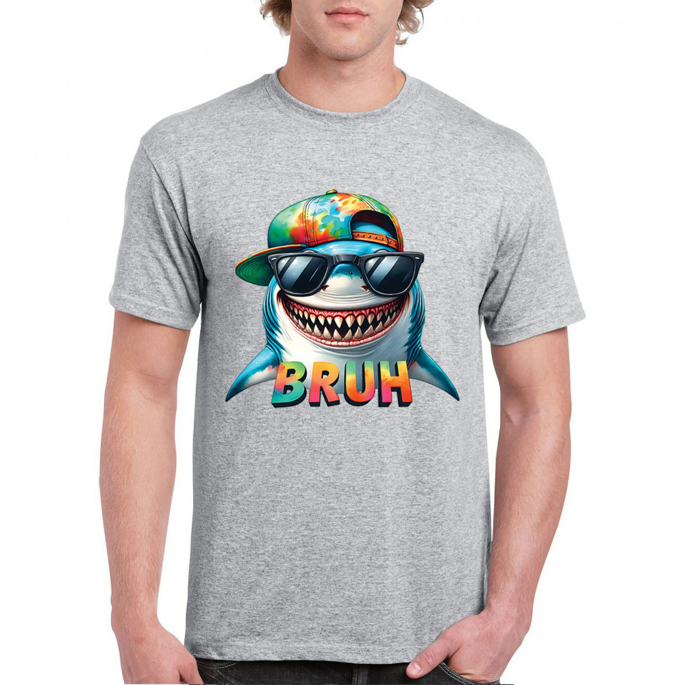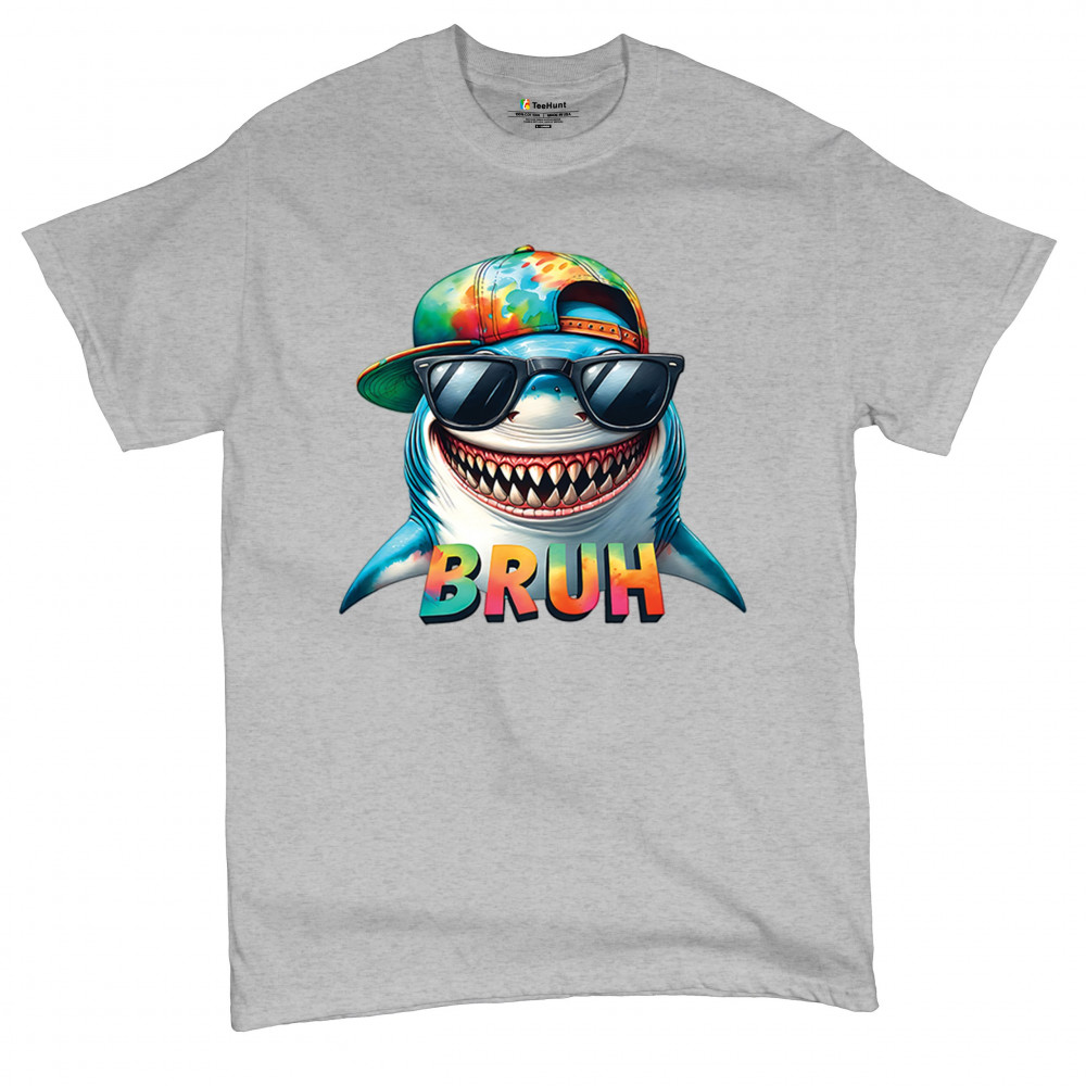 Bruh Shark meme shirt with Gen Z humor, cartoon shark design, summer beach vibes, Sigma Aura, and Italian Brainrot internet humor.