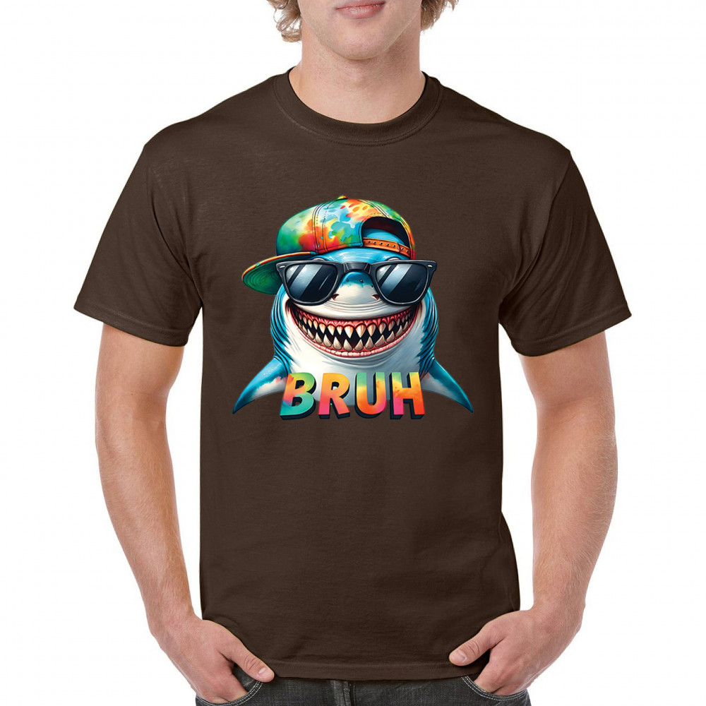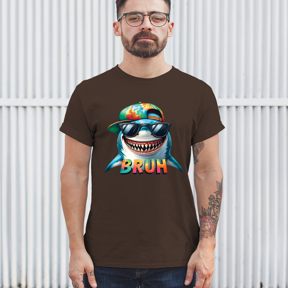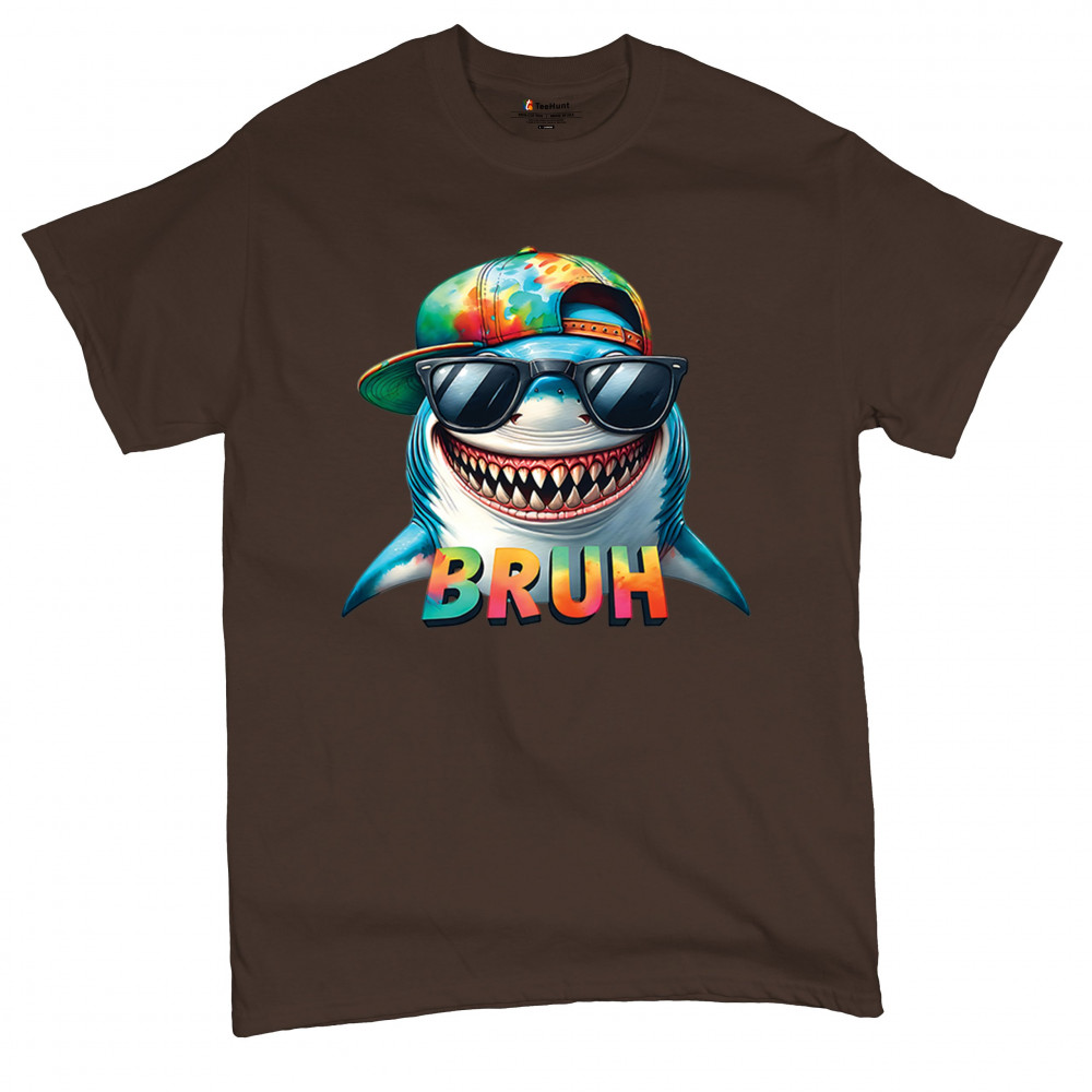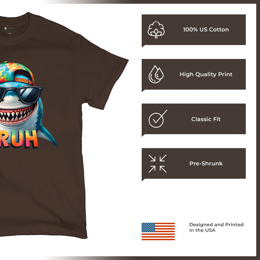 Bruh Shark meme shirt with Gen Z humor, cartoon shark design, summer beach vibes, Sigma Aura, and Italian Brainrot internet humor.